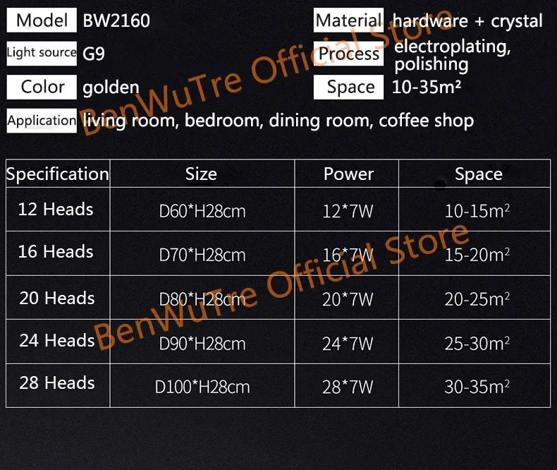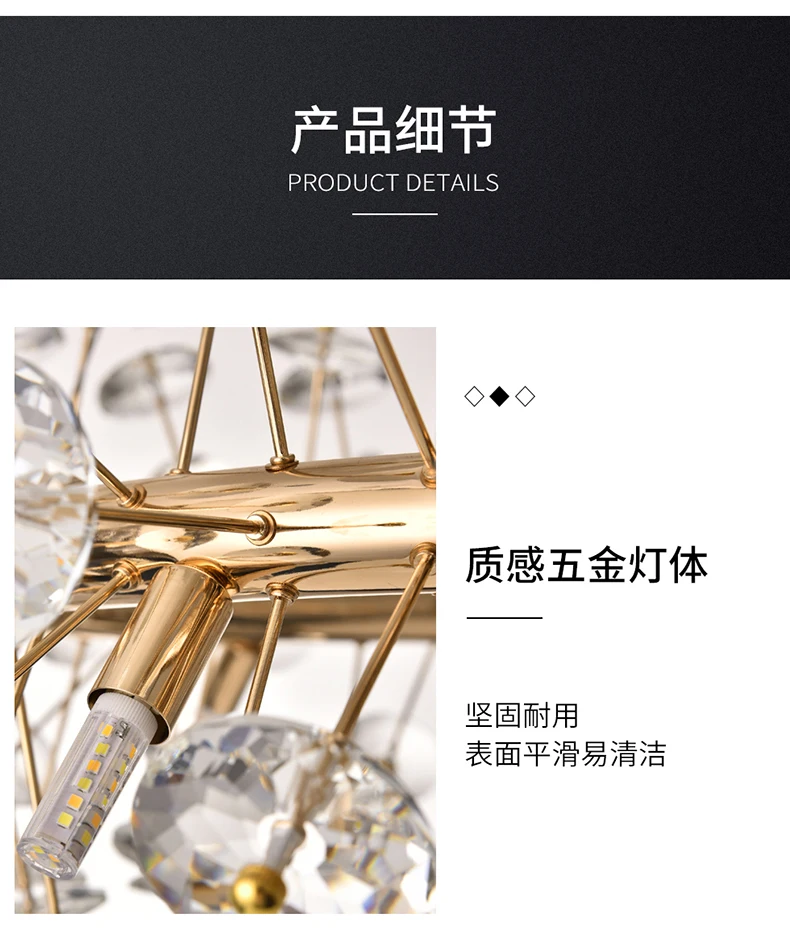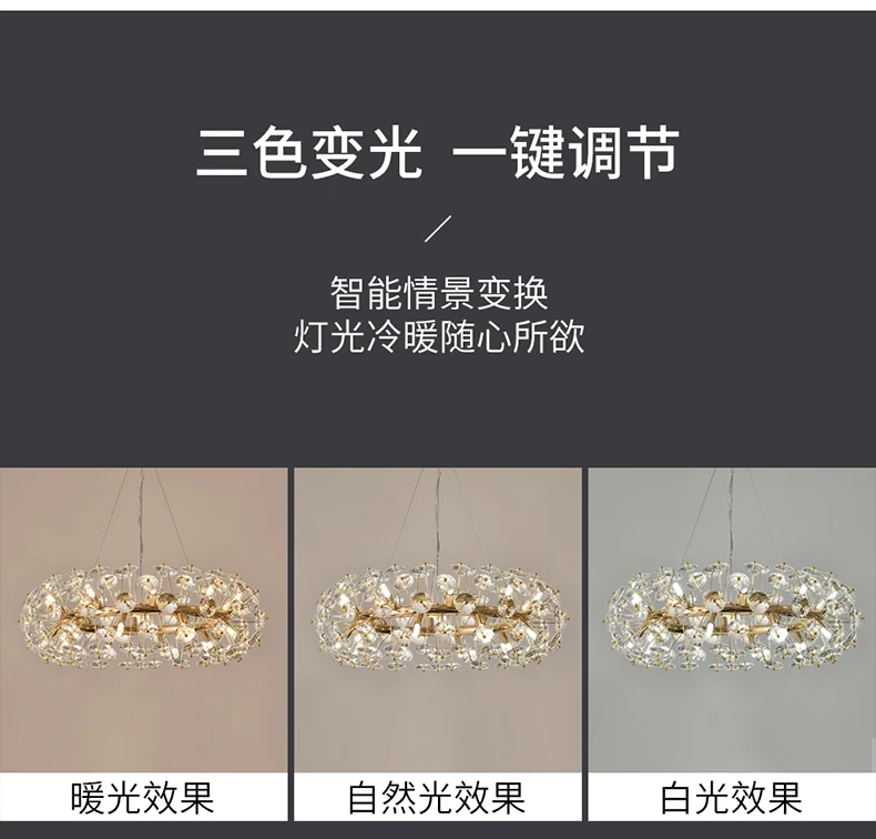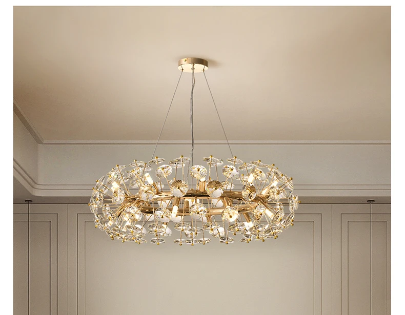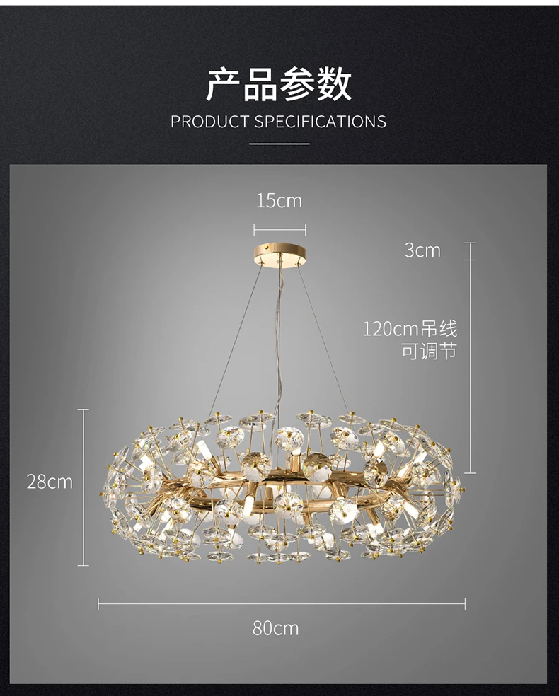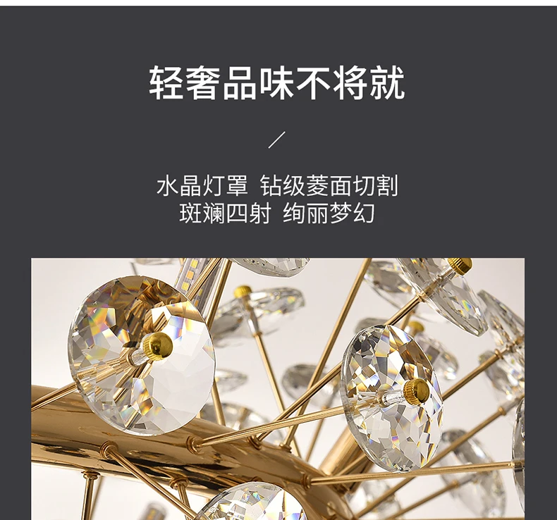 Корпус лампы: золотистый Материал: фурнитура + кристалл Светильник источник: G9 Подходит для: гостиной, столовой, спальни, виллы, лобби Размер: 12 головок-диаметр 60 см 16 головок-диаметр 70 см 20 головок-диаметр 80 см 24 головки-диаметр 90 см (Регулируемая подвесная линия) (Сменные: Есть три цветовых температуры, которые можно переключать (Теплый светильник, нейтральный светильник, холодный белый светильник). Через настенный выключатель, непрерывное включение и выключение для переключения цветовой температуры.)