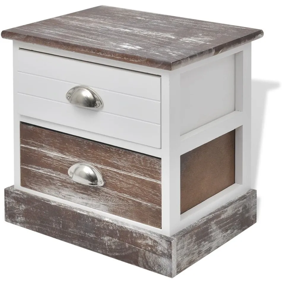 DESCRIPTION This chic bedside cabinet in a classic French country house style will add a touch of rustic charm to your bedroom, living space or lounge room. It can also be used as a telephone stand, side cabinet, small cabinet, drawer cabinet, storage cabinet, nightstand, night cabinet, bedroom cabinet, end table, end cabinet, etc. This compact cabinet with a vintage look has 2 smoothly running drawers, which provide ample space for keeping smaller items organised and within reach. Made of high-quality materials, this cabinet is very durable. Colour: Brown and white Material: Paulownia wood + plywood Overall dimensions: 38 x 28 x 38 cm (W x D x H) Drawer dimensions: 31.5 x 23 x 12.5 cm (W x D x H) With 2 drawers In a classic French country house style Can be used as a bedside cabinet, telephone stand, side cabinet, small cabinet, drawer cabinet, storage cabinet, nightstand, night cabinet, bedroom cabinet, end table, end cabinet, etc.