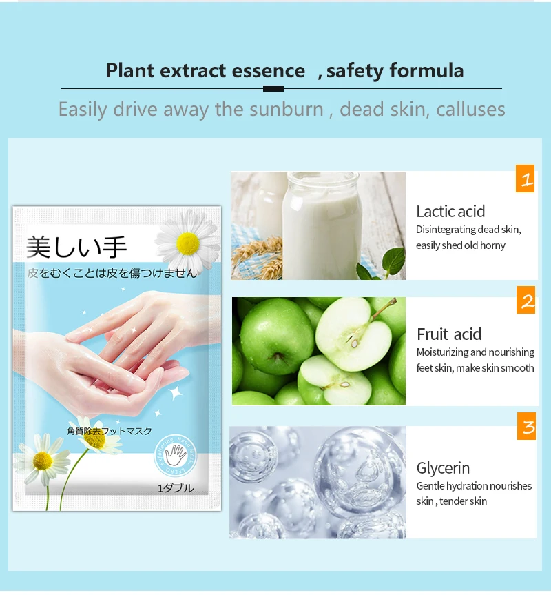 1. Вымойте и Замочите ноги горячей водой, а затем высушите ноги. 2. Используйте ножницы, чтобы вырезать Уплотнение Маски для ног посылка. 3. Носите маску для ног, мы рекомендуем носить пару нормальных носков снаружи, чтобы обеспечить достаточный контакт с эссенцией. 4. Снимите маску для ног через 35-95 минут, затем очистите ноги. 5. Большинство людей начинают очищать омертвевшую кожу после 48 часов использования, но из-за различных типов кожи кому-то может потребоваться 2-3 пары, пожалуйста, используйте маску для ног снова 48 часов позже. 6. Не используйте маску, если у вас есть активный порез или ран. 7. Мы предлагаем вам замочить ноги горячей водой после 48 часов использования.