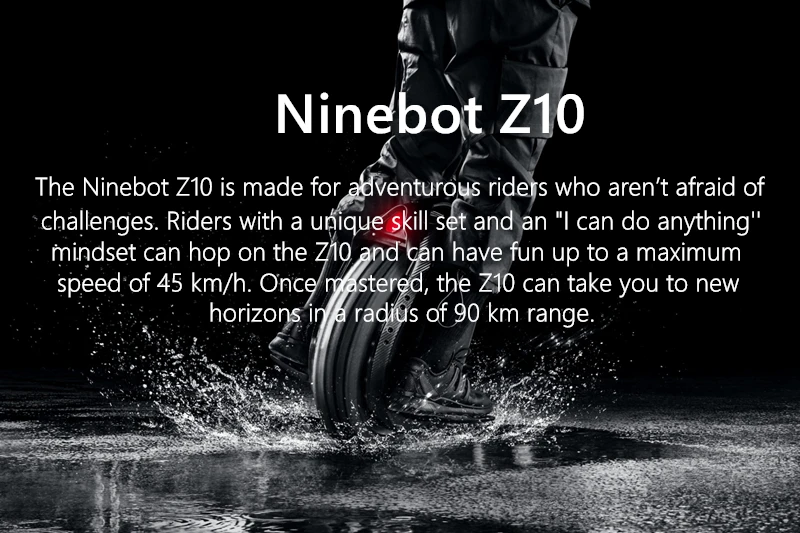 Ninebot Z10 создан для любителей приключений, которые не боятся проблем. Гонщики с уникальным набором навыков и «я могу сделать все, что угодно», могут прыгать на Z10 и получать удовольствие до максимальной скорости 45 км/ч. После овладения, Z10 может доставить вас на новые горизонты в радиусе 90 км.