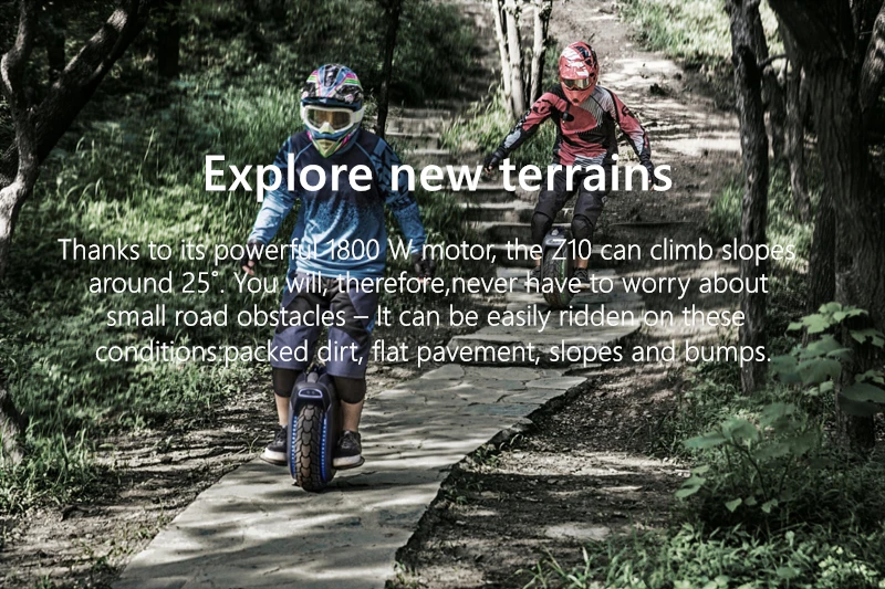 Благодаря мощному двигателю мощностью 1800 Вт Z10 может лазить на склоны около 25 ˚. Поэтому вам никогда не придется беспокоиться о небольших дорожных препятствиях-их можно легко наносить на эти условия: упакованные грязь, плоская тротуар, склоны и шишки.