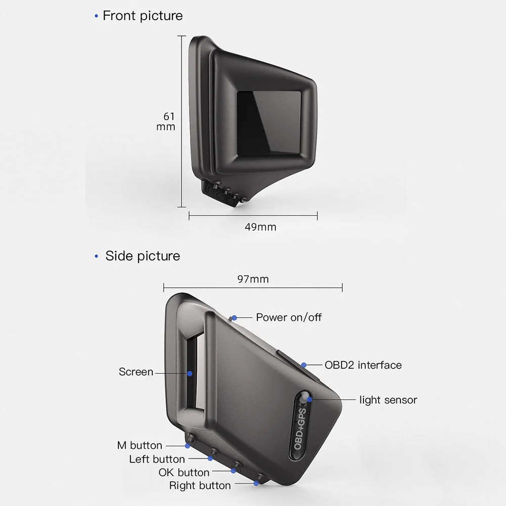 Режим OBD2: скорость, скорость вращения, температура воды, напряжение, расход топлива, часы, одно расстояние, одно время в пути, температура масла, давление турбины, испытание на ускорение, испытание на тормоз, сигнализация превышения скорости, сигнализация неисправности двигателя, устранение кода неисправности, сигнализация температуры воды, сигнализация скорости, сигнализация напряжения, Переключатель mile, напоминание о усталости вождения, автоматическая и ручная регулировка яркости.