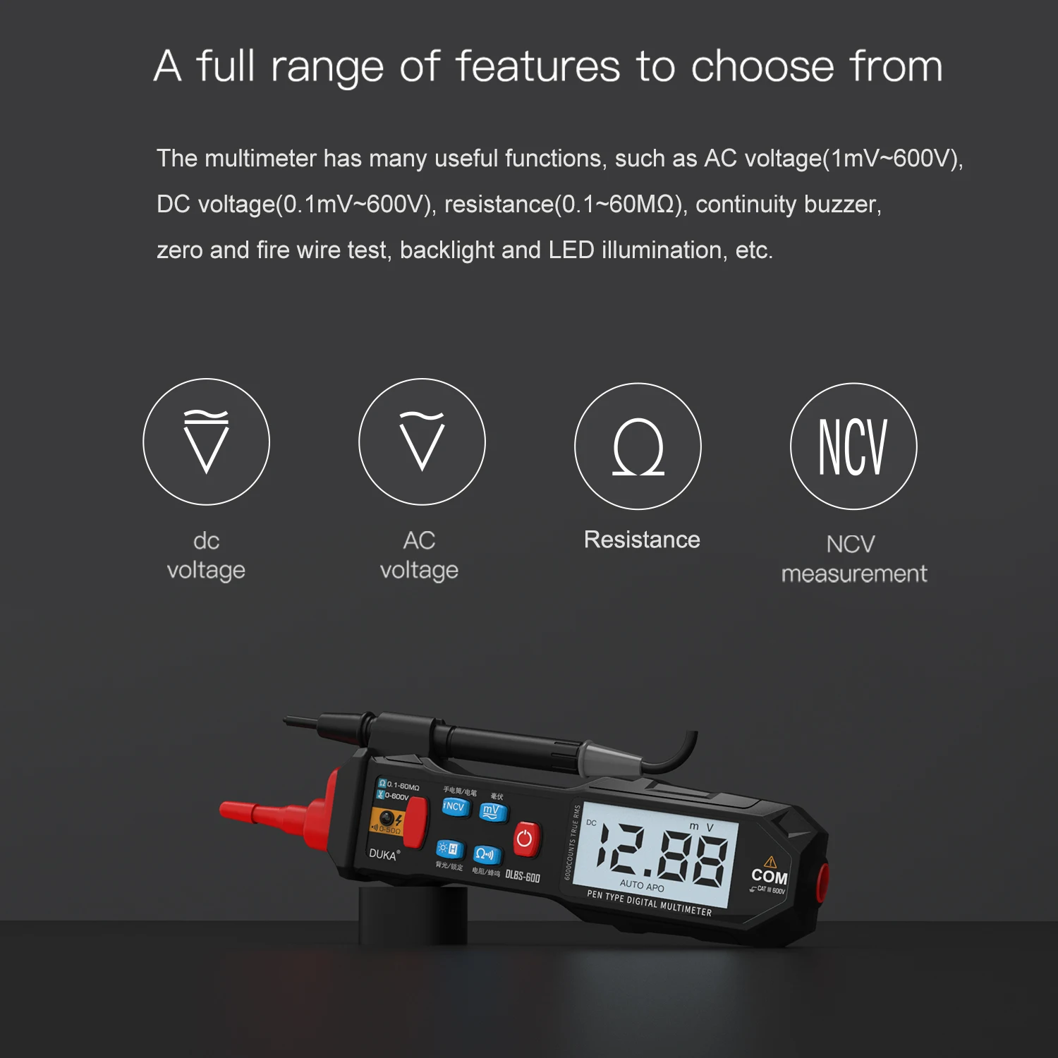 Многофункциональный цифровой тестер er: Он имеет множество полезных функций, таких как напряжение переменного тока (мВ В ~ 600 В), напряжение постоянного тока (0,1 мВ В ~ 600 в), сопротивление (0,1 ~ 60 МОМ), зуммер непрерывности, проверка нулевого и пожарного проводов, подсветка светодиодный светодиодное освещение и т. д.