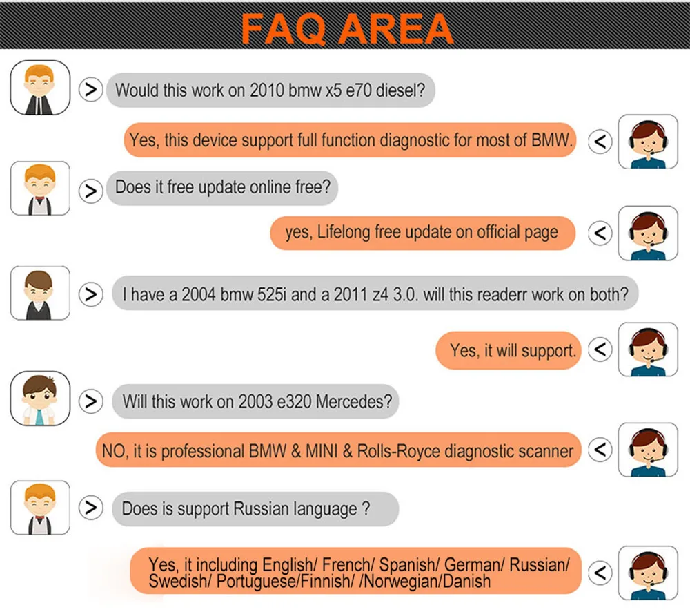 1. Как начать? Просто подключите порт OBD II на вашем автомобиле и включите зажигание, и вы готовы к работе. Он не нуждается в аккумуляторе или зарядном устройстве, получает питание непосредственно от разъема передачи данных OBDII в вашем автомобиле. 2. Почему ошибка соединения транспортного средства? I: подтвердите, что зажигание включено, проверьте, надежно ли соединитель инструмента сканирования подключен к DLC транспортного средства; II: Выключите зажигание и подождите около 10 секунд, включите зажигание и продолжите тестирование; III: Убедитесь, что модуль управления не неисправен. 3. Как изменить меню на русском языке? AUTOPHIX 7910 работает с английским, немецким, французским, испанским, финским, голландским, русским и португальский, вы можете выбрать из меню настроек. 4. Как я могу изменить яркость экрана? AUTOPHIX 7910 имеет два стиля кожи для выбора, вы можете выбрать белую кожу для улучшения видимости в течение дня, и вы можете выбрать черную кожу, чтобы защитить ваши глаза в течение ночи. Эти функции можно выполнить в меню настроек. 5. Будет ли это работать на 2010 bmw x5 e70 дизель? Да, это устройство поддерживает полную диагностику для большинства BMW. 6. Бесплатное ли обновление онлайн бесплатно? Да, пожизненное бесплатное обновление онлайн. 7. У меня есть 2004 bmw 525i и 2011 z4 3,0. Будет ли этот ридер работать на обоих? Да, он будет поддерживать. 8. Будет ли это работать на 2003 e320 Mercedes? Нет, это профессиональный сканер для диагностики BMW & MINI & Rolls-Royce.