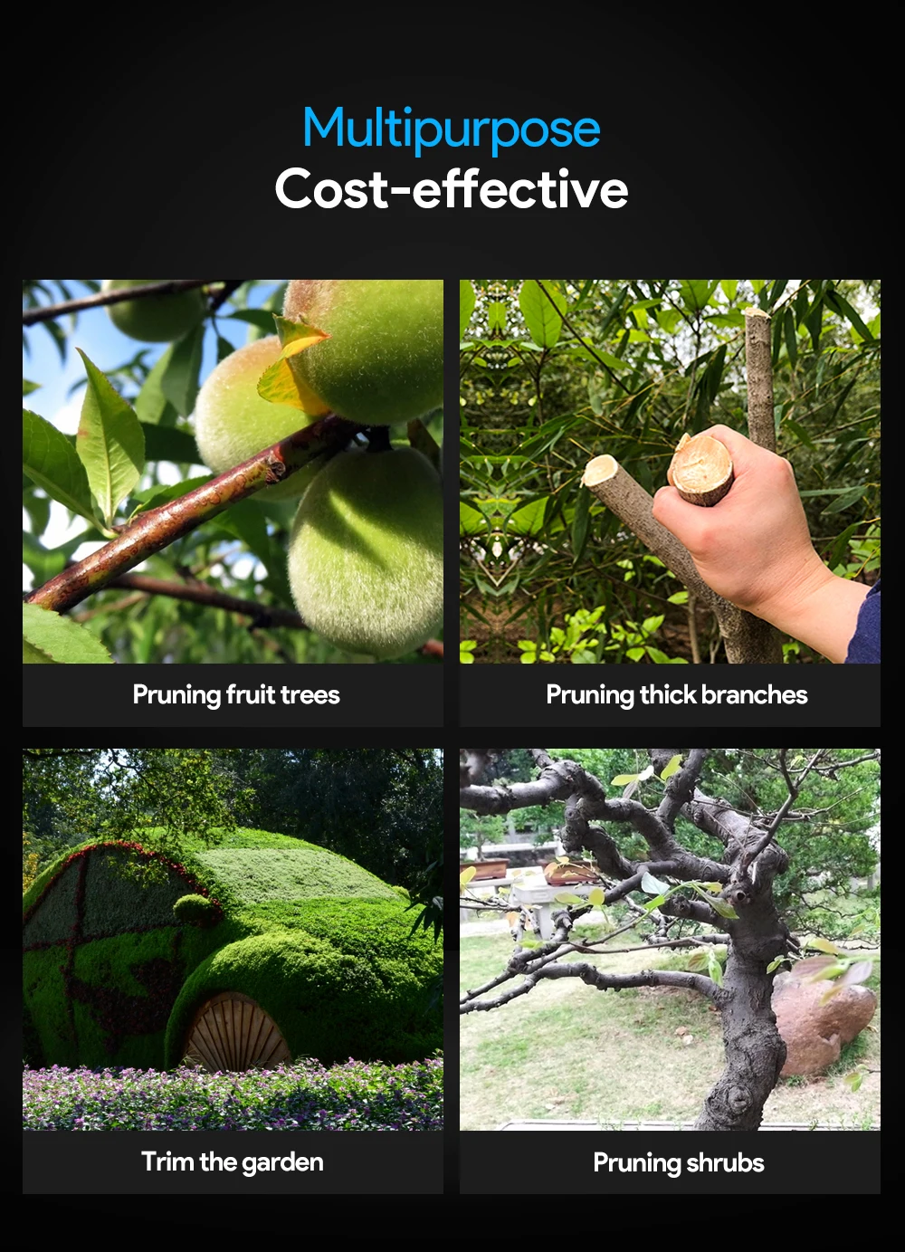 [В любом месте и в любое время работы]-вес тела около 700 г, аккумулятор около 300 г, его портативный дизайн позволяет пользователям гибко управлять им в различных условиях. Cekegon Электрический секатор имеет широкий спектр применения, все виды садов, парков, ферм, больших пастбищ, садов, теплиц, вы можете вырезать виноград, Вишневое дерево, яблони и т. Д.