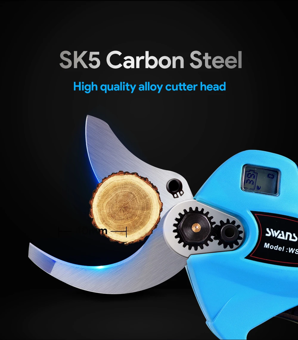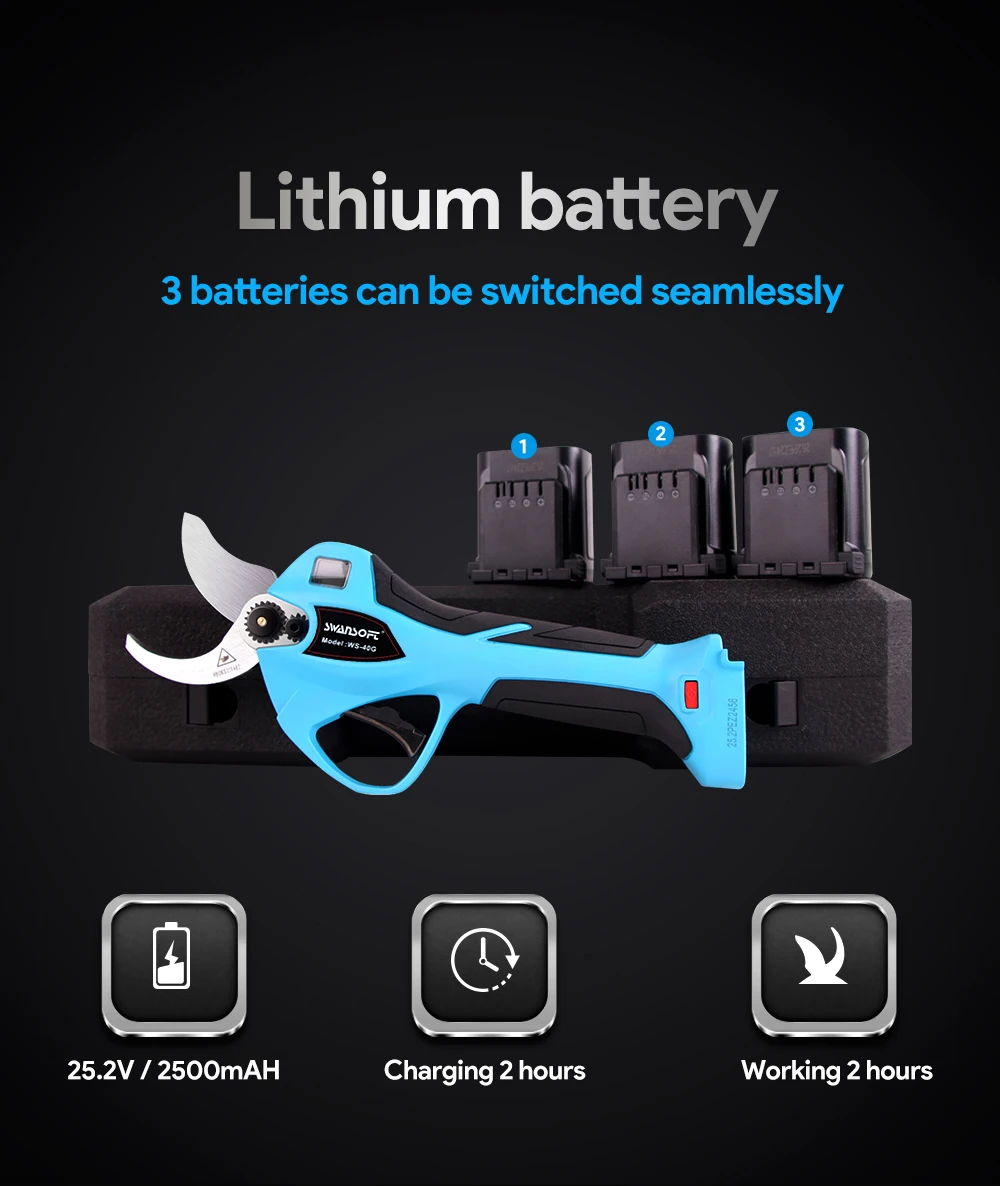 [Очень острая и сильная мощность] -- профессиональный беспроводной секатор выкован из швейцарской высокоуглеродистой стали SK5 и питается бесщеточным двигателем. Он Чрезвычайно острый и долговечный, что позволяет легко отрезать 40 мм жесткой и не повредит ветви. Также срок его службы в 3-5 раз превышает срок службы обычного мотора кисти.