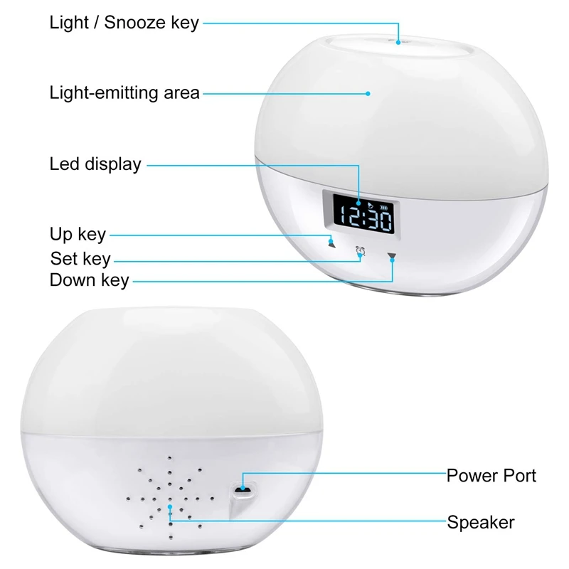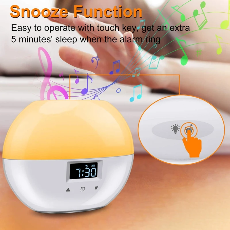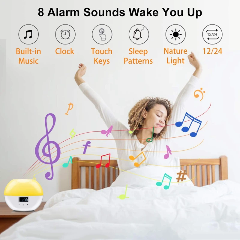 Будильник поможет вам постепенно просыпаться с естественным светильник и естественным звуком, давая вам расслабляющее настроение утром.