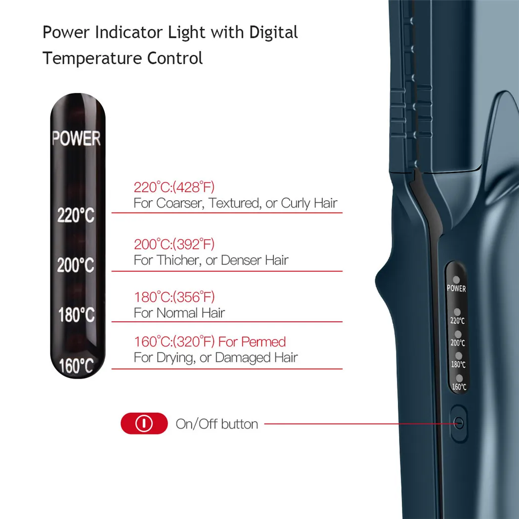 ▲ 4 регулируемые температуры: 160 ℃, 180 ℃, 200 ℃, 220 ℃. Позволяет регулировать температуру в соответствии с разными волосами.