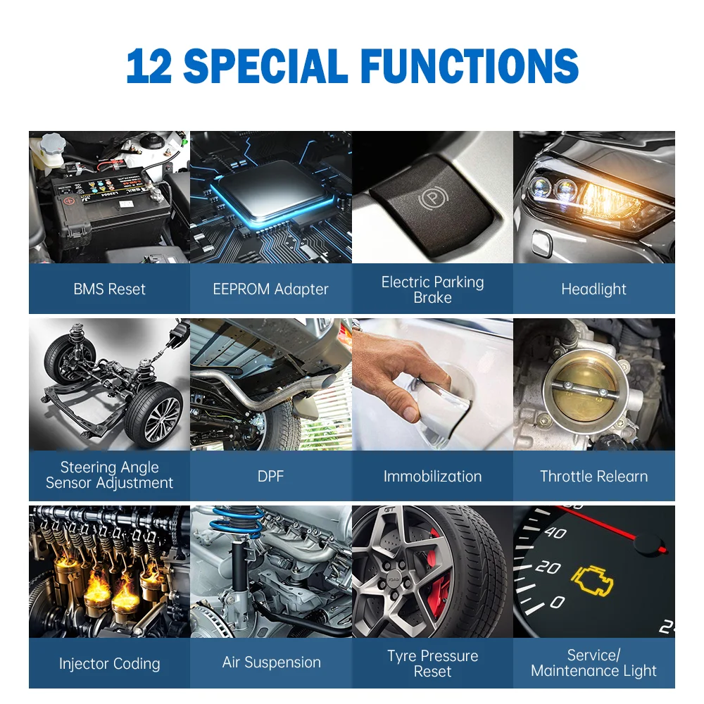 > Сервис сброса масла: Выполняет сброс для системы срока службы моторного масла, которая подсчитывает оптимальный интервал изменения срока службы масла в зависимости от условий вождения автомобиля и климата, и выключает предупреждающий сигнал; > Электронный стояночный тормоз (EPB) Сервис: Поддерживает электронную тормозную систему безопасно и эффективно, деактивируя и активируя систему управления тормозом, помогая контролировать тормозную жидкость, открывая и закрывая тормозные колодки, а также устанавливая тормоза после замены диска или колодки и т. Д. > Датчик угла поворота руля (SAS) Сервис: Производит калибровку для датчика угла поворота руля (SAS), который постоянно сохраняет текущее положение рулевого колеса как прямое положение в датчике угла поворота руля EEPROM. После успешного завершения калибровки автоматически очищается память о неисправности датчика угла поворота руля. > Система контроля давления в шинах (TPMS) Обслуживание: Функция обслуживания TPMS включает отображение id датчика от ЭБУ транспортного средства, ввод ID замены датчика TPMS и датчики тестирования > DPF услуги: Выполнять множество функций для дизельной системы Сажевых фильтров. Инструмент будет управлять регенерацией DPF, заменой компонентов DPF teach-in и DPF teach-in после замены блока управления двигателем. > BMS Сброс: Повторное соответствие модуля управления и моторизованного датчика для более точного обнаружения батареи, четкая оригинальная информация о низком заряде батареи и предотвращение того, что соответствующий модуль управления обнаруживает ложную информацию. > IMMO сервис: Позволяет отключить ключи от утерянного автомобиля и запрограммировать сменный брелок. > EEPROM адаптер: Работает со старыми моделями Автомобилей, когда эти автомобильные чипы или ключи должны сделать программатор