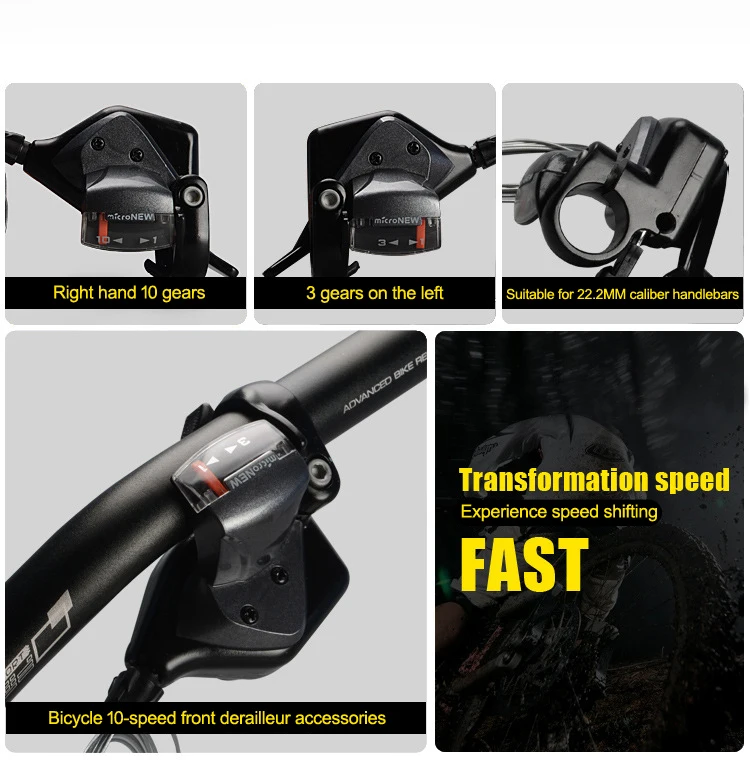 Особенности: ➢ Просты в установке. Easy легко читаемое окно индикатора шестерни. Handle ручка триггерного типа, облегчает работу с переменной скоростью, с внутренними кабелями Suitable подходит для руля диаметром 22,2 мм. Flexible Гибкая передача, плавное переключение, индекс также включен. Larger улучшенное положение большого пальца обеспечивает удобное сцепление. Характеристики: Цвет: черный Материал: алюминиевый сплав и пластик Правый рычаг: 7/8/9/10/11 Скорость прямо триггерный переключатель передач Левый Рычаг: 3 скоростной триггерный переключатель передач Посылка включает в себя: 1 пара левого и правого тормоза/Перестановка комбо набор 2 x кабели из нержавеющей стали