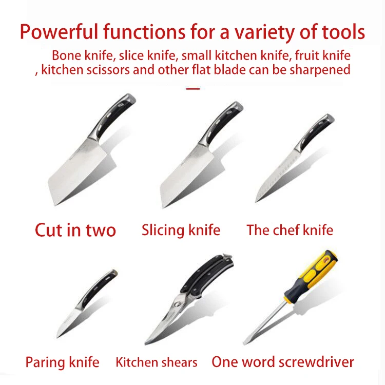 3. Легкая и эффективная заточка ножей-2800 об/мин Электрическая точилка для ножей, может автоматически затачивать тупой край ножа за 5 секунд, что позволяет быстро и трудозатратно, чем традиционная ручная точилка для ножей.