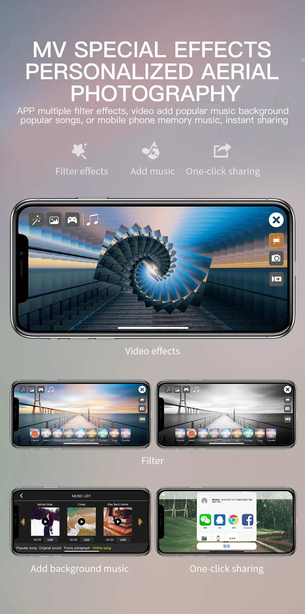-MV функции: фильтры, видеоэффекты, добавление фоновой музыки, обмен фотографиями/видео