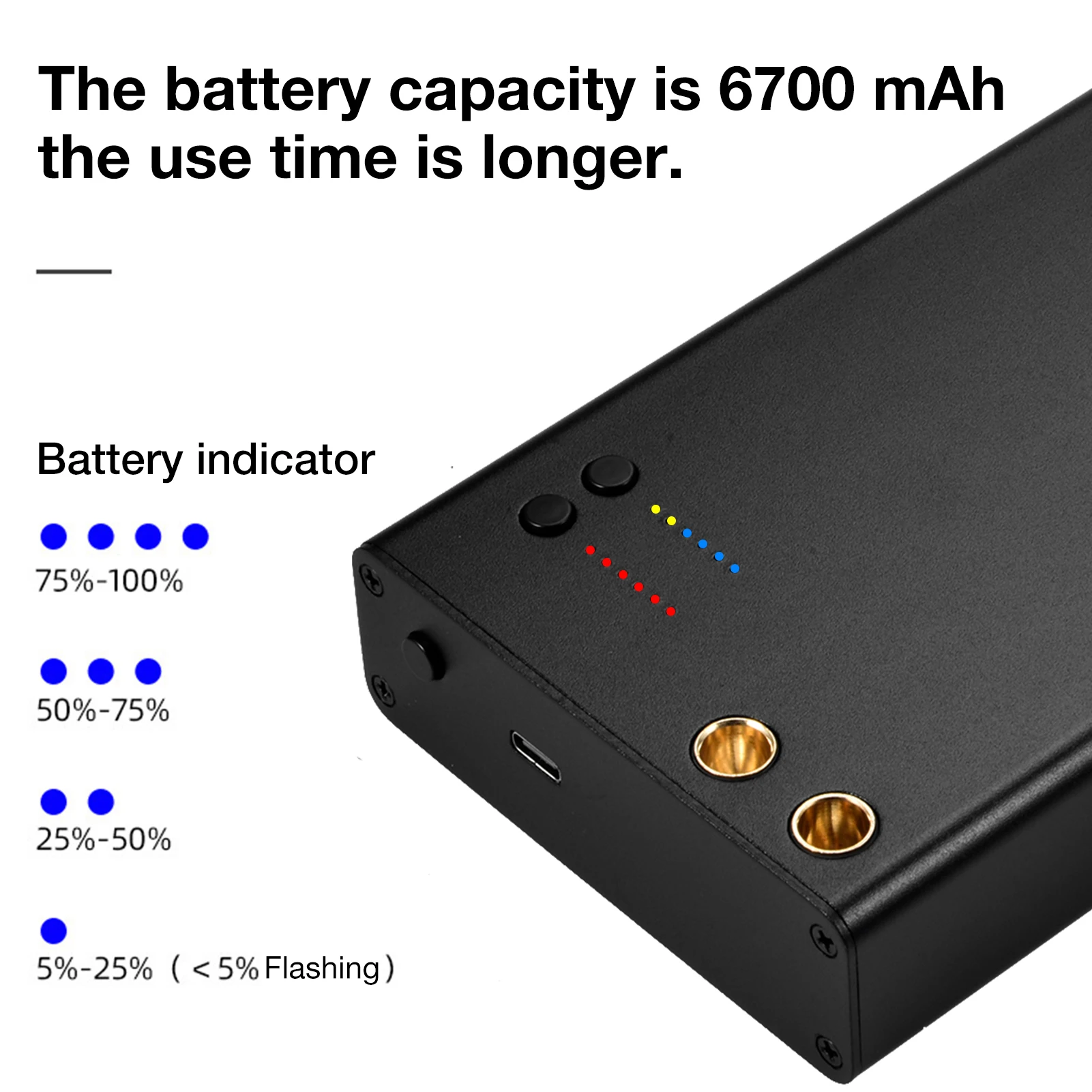 5. Оснащен индикатором электричества светильник (синий), различные цифры, чтобы показать различное количество электроэнергии, 1 светильник (5-25%, вспышка <5%), 2 светильник s(25-50%), 3 светильник s(50-75%), 4 светильник s(75-100%).