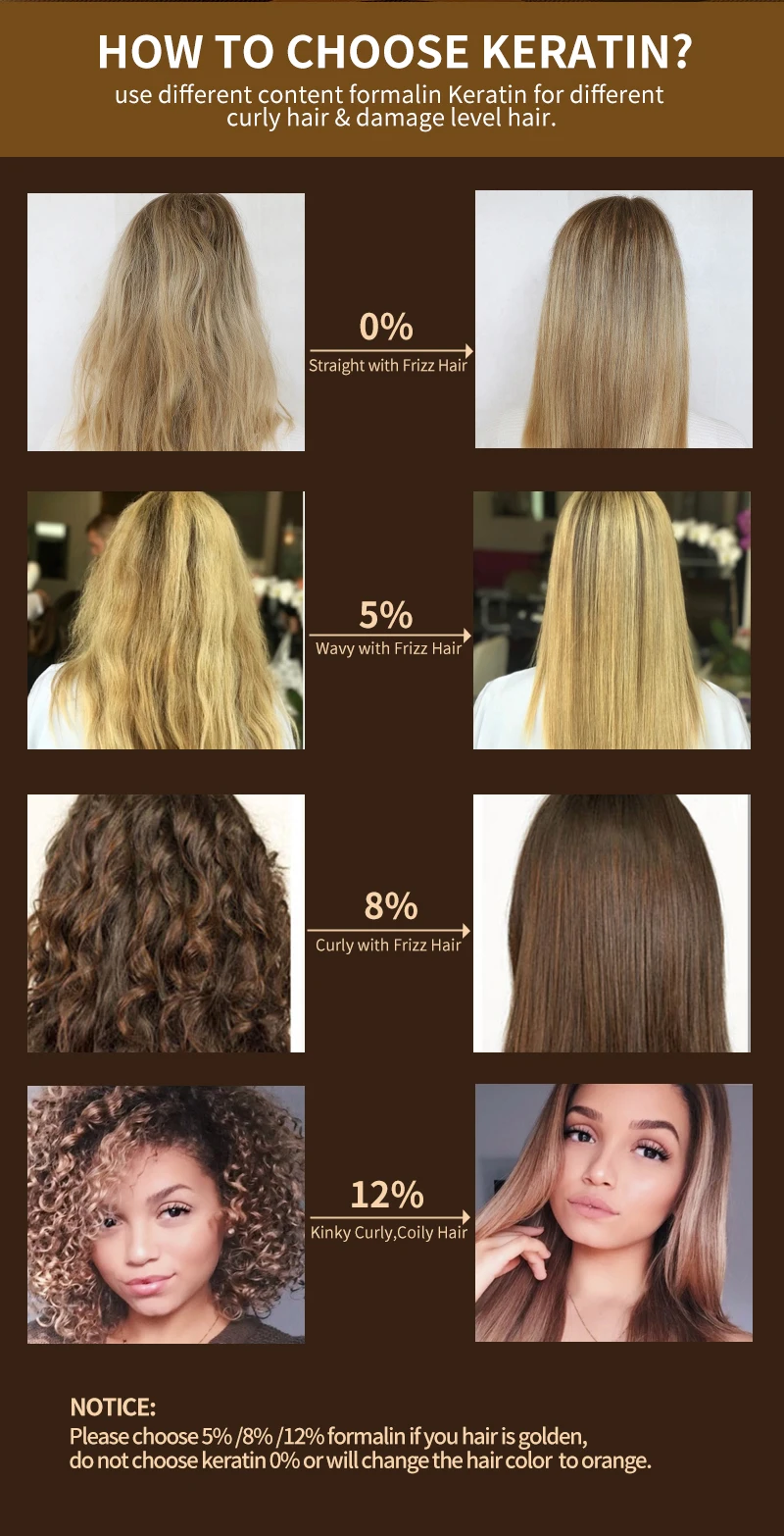 Примечание: 1. Если ваши волосы естественные кудрявые, пожалуйста, выберите 8% или 12% кератина формалина