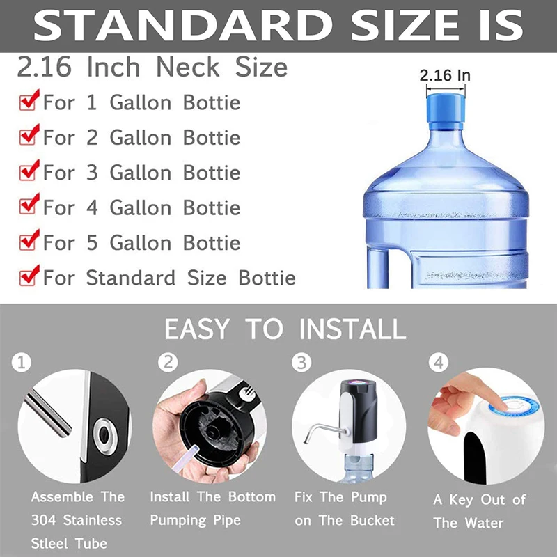 Обратите внимание: по надзору за качеством питьевой воды насос подходит для галлонов бочки с 2,16 дюймов (5,5 см) на шее. Пожалуйста, подтвердите размер вашей бутылки перед покупкой.