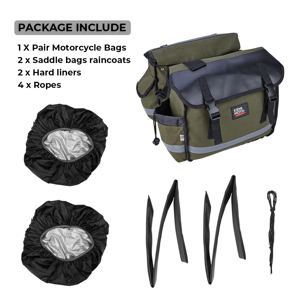 1 X Pair of Motorcycle Bags 2 x waterproof saddle bags (only upgrade bag include) 2 x hard coatings (only upgrade bag include) 4 x ropes (only upgrade bag include)