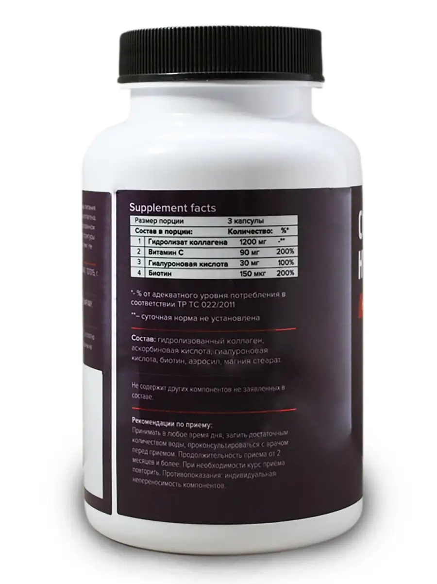 Состав продукта: коллаген говяжий, аскорбиновая кислота, гиалуроновая кислота, биотин, аэросил, магния стеарат.