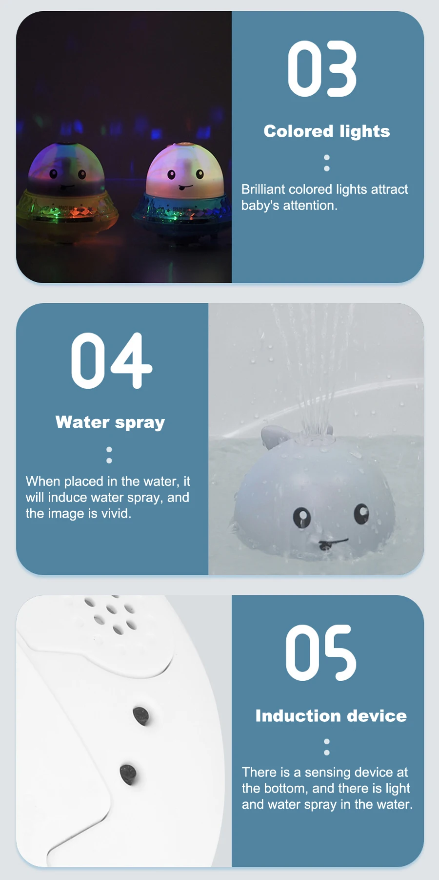 Информация о товаре: Наименование товара: автоматический индукционный Спринклер Материал: экологически чистый пластик + электронные компоненты Требуемая Батарея: 3 батарейки типа AAA, покупателям необходимо взять с собой собственные аккумуляторы. Обычные Особенности: размещается на воде, автоматический распылитель воды, в сочетании с красивыми огнями мигает Функция базовой модели: распылитель воды + Универсальная база 2 в 1 база с универсальной функцией колеса, сопутствующая музыка и освещение Особенности: Милые мультфильмы-это милые и любимые малышом. Верхний носик деликатный и может распылить много водяного столба Размещенный на воде, он автоматически поглощает воду без выключателя Использование батареи: три батарейки ААА, длительный срок службы батареи, оснащено уплотнительным кольцом для предотвращения утечки
