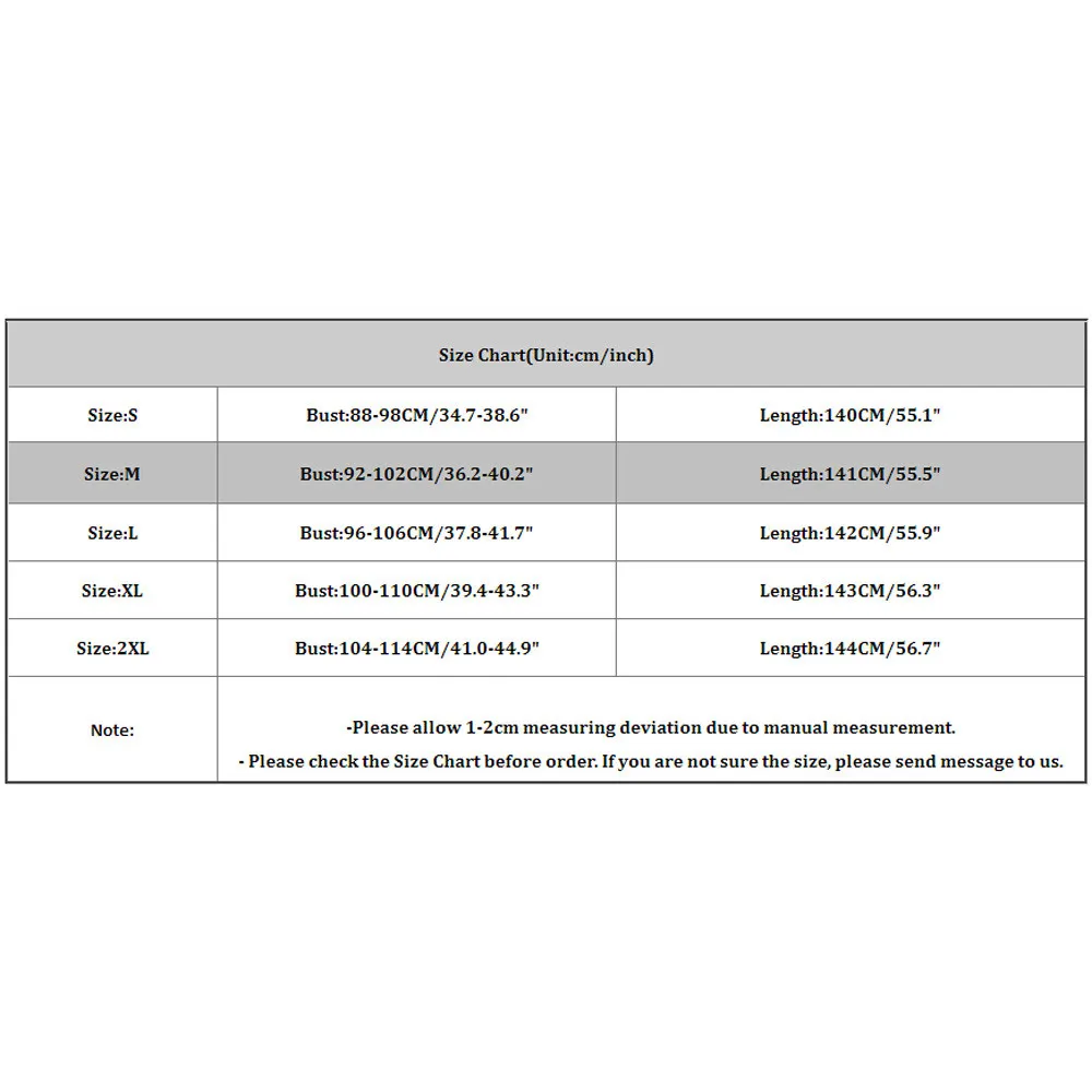 Таблица размеров (единица измерения: см/дюйм) Размер: S Бюст: 88-98 см/34,7-38,6" Длина: 140 см/55,1" Размер: M Бюст: 92-102 см/36,2-40,2" Длина: 141 см/55,5" Размер: L Бюст: 96-106 см/37,8-41,7" Длина: 142 см/55,9" Размер: XL Бюст: 100-110 см/39,4-43,3" Длина: 143 см/56,3" Размер: 2XL Бюст: 104-114 см/41,0-44,9" Длина: 144 см/56,7" Примечание: