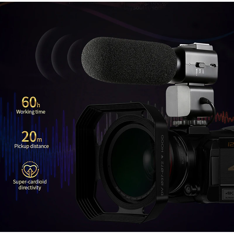 Камера 4k professional поставляется с широкоугольным объективом, микрофоном, блендой и держателем.