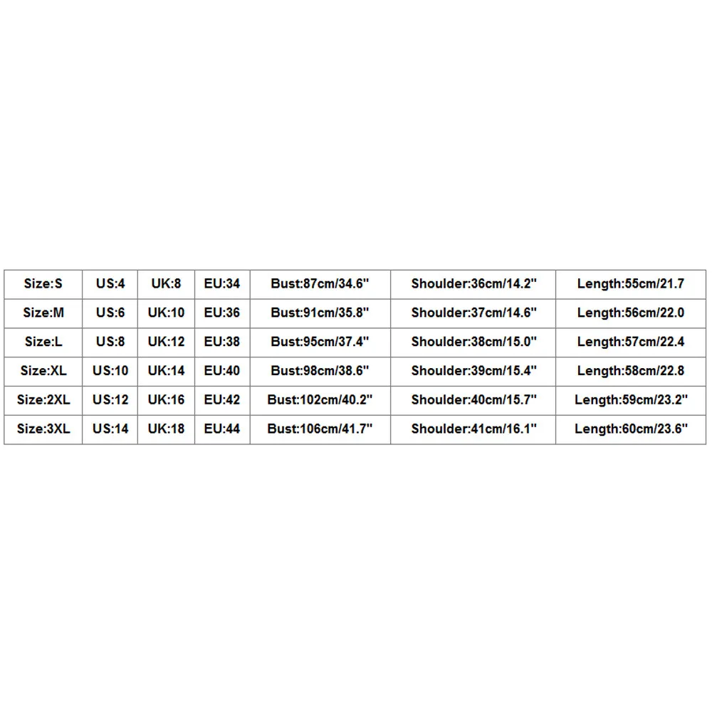 Размер США Великобритания ЕС Бюст Плечо Длина S 4 8 34 87 см/34,6" 36 см/14,2" 55 см/21,7 М 6 10 36 91 см/35,8" 37 см/14,6" 56 см/22,0 L 8 12 38 95 см/37,4" 38 см/15,0" 57 см/22,4 XL 10 14 40 98 см/38,6" 39 см/15,4" 58 см/22,8 2XL 12 16 42 102 см/40,2" 40 см/15,7" 59 см/23,2" 3XL 14 18 44 106 см/41,7" 41 см/16,1" 60 см/23,6"