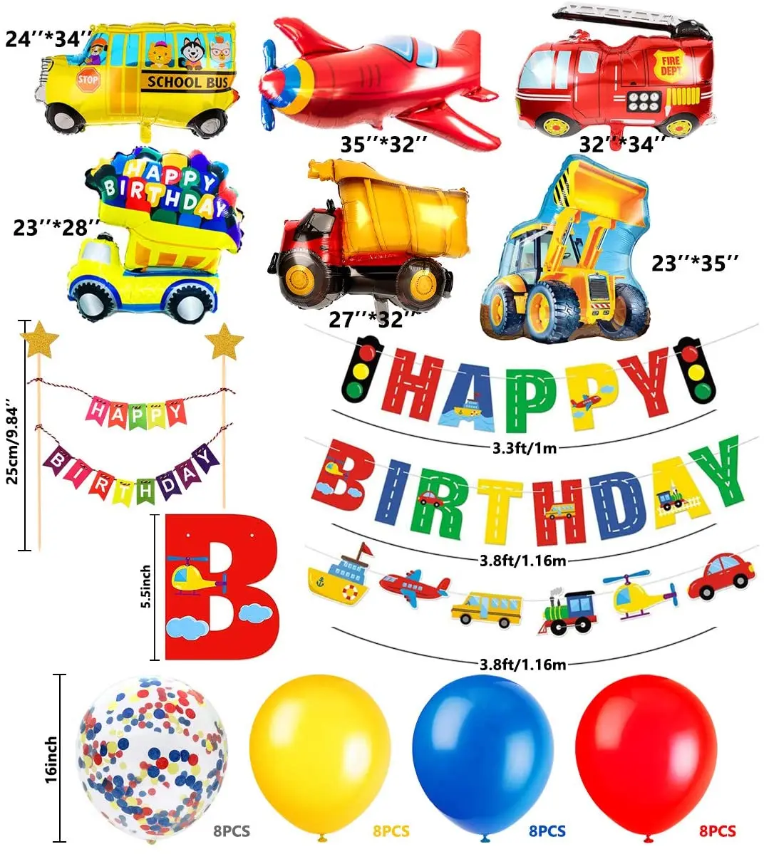 Украшения на день рождения мальчика: 13 баннеров на день рождения для транспортировки, 1 школьный автобус, 1 поезд, 1 пожарная машина, 1 Мусоровоз, 1 вилочный погрузчик, 1 самолет, 8 воздушных шаров конфетти, 24 юаня синий/желтый/зеленый шары, 5 транспортных тележек торт Топпинг.