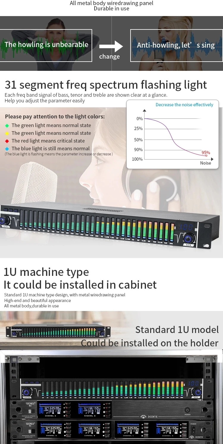 ① Каждый участок светодиодный светодиодной индикацией спектра, точка частоты в реальном времени 31 полоса абсолютная точность 99%