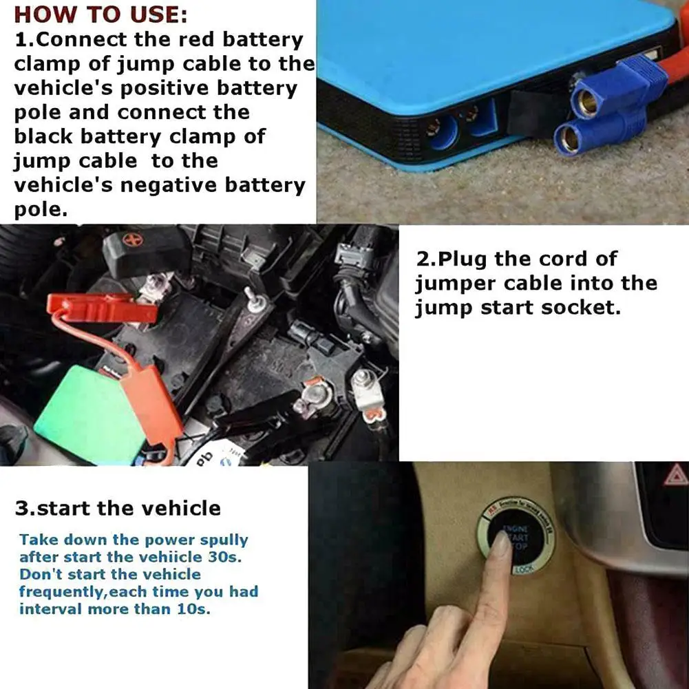 Начните свой любимый автомобиль, зарядите свою электронику, убедитесь, что ваш автомобиль может вернуться домой, когда он окажется на мель. Он начнет прыгать до 2.0L газовый автомобиль на одной полной зарядке. Позвольте пусковому устройству остыть не менее 30 секунд после каждого запуска.)