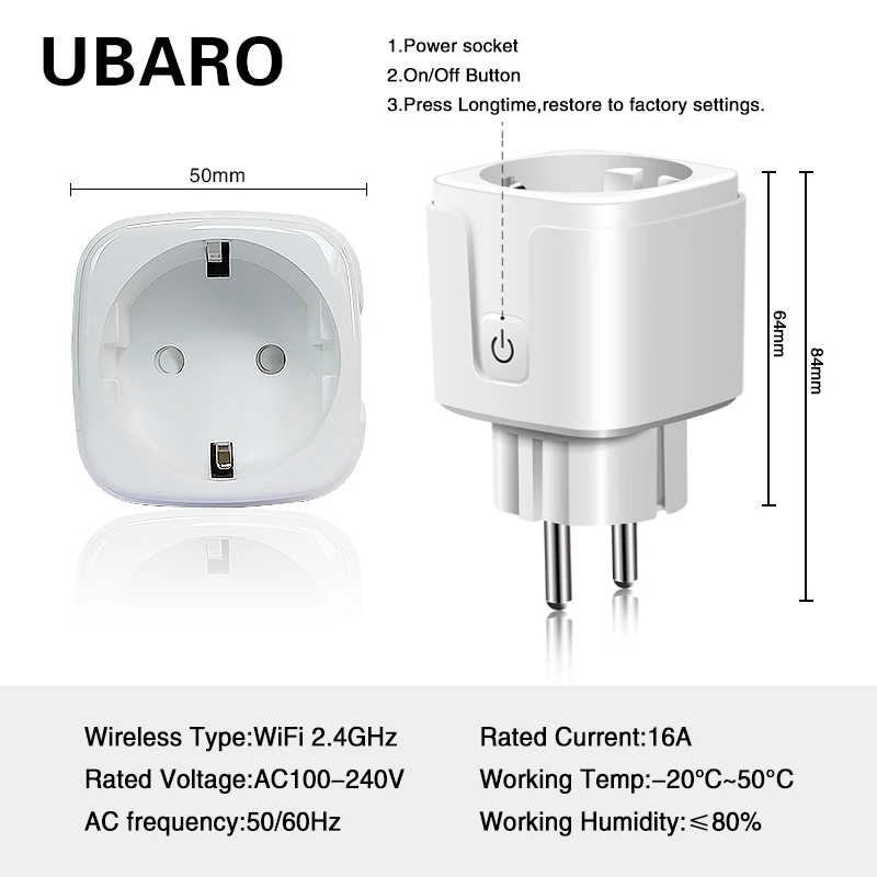 Товар Smart Plug Материал: АБС-пластик + Поликарбонат Напряжение: 100-240V 50/60Hz Ток: 16А Макс. Мощность: 3500 Вт Рабочая температура: -20 ℃ ~ 50 ℃ Стандарт WI-FI: 2,4 ГГц 802.11bgn Требования к ступице: нет Требования к Wi-Fi: Да Монитор питания: Да Сетевая безопасность: WPA/WPA2” Режим управления: APP/Voice/Manual Система поддержки: выше iOS 8,0 и Android 4,3 Голосовая поддержка: Google assistant и Amazon Alexa Язык: 21 язык s Сертификация: CE/RoHS Приложение: Tuya Smart/Smart Life