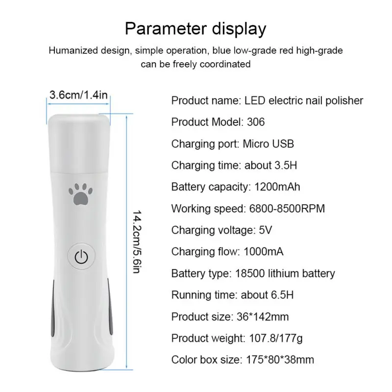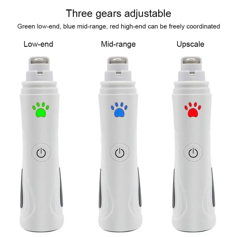 Features:1. The LED double lamp design can clearly illuminate the bleeding line, avoid damaging the pet's blood line and protect the nails.2. Multi-port design, suitable for all kinds of pets, suitable for large and small pets, and it is safer to wear. Dogs/cats/squirrels, etc.3. A variety of polish methods are available, free and fast polish, small pet polish, medium and large pet polish. A beautiful, rounded type A can be repaired, and the pet will be in a better mood, which can effectively protect the furniture, sofas, walls, etc. at home.4. Universal data cable charging. Computers, power banks, and mobile phone charging heads can be used.5. Low-shock and low-noise experience, avoid frightening pets, and easily sharpen nails.6. The grindstone adopts a hard diamond grindstone to trim pet nails easily.7. Three gears are adjustable, green is low gear, blue is middle gear, and red is high gear, which can be freely coordinated and switched.Package description:1* nail polisher1* charging cable