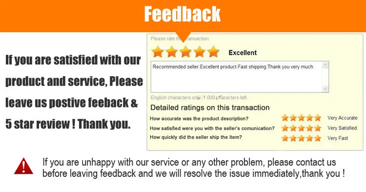 1. Если вы удовлетворены нашим продуктом и обслуживанием, пожалуйста, оставьте нам положительный отзывы и 5 звезд! Мы будем очень признательны! Спасибо. 2. Мы будем иметь 15 дней больше защиты после завершения заказа. 3. Когда у вас возникнут какие-либо проблемы с продуктами, пожалуйста, свяжитесь с нами вовремя, мы решим их для вас. Ваши отзывы гораздо важнее для нас. Спасибо!