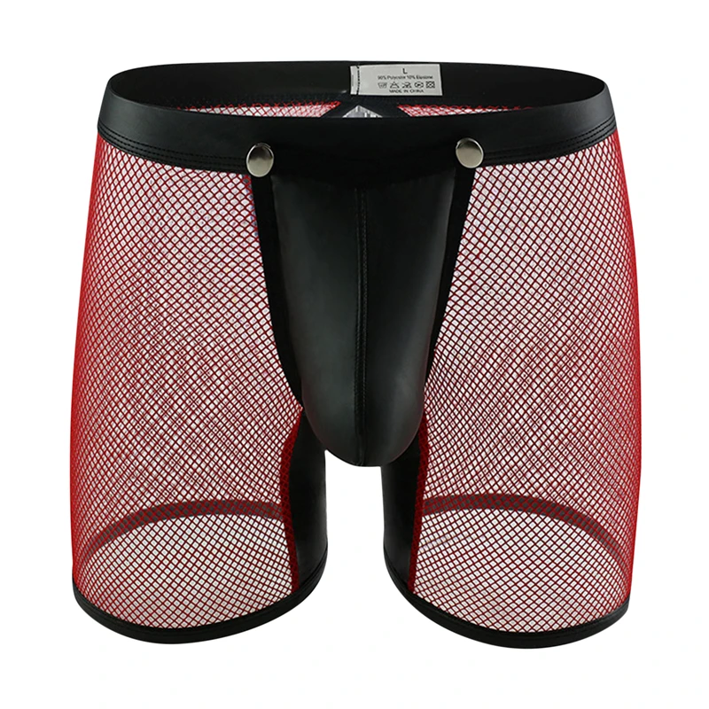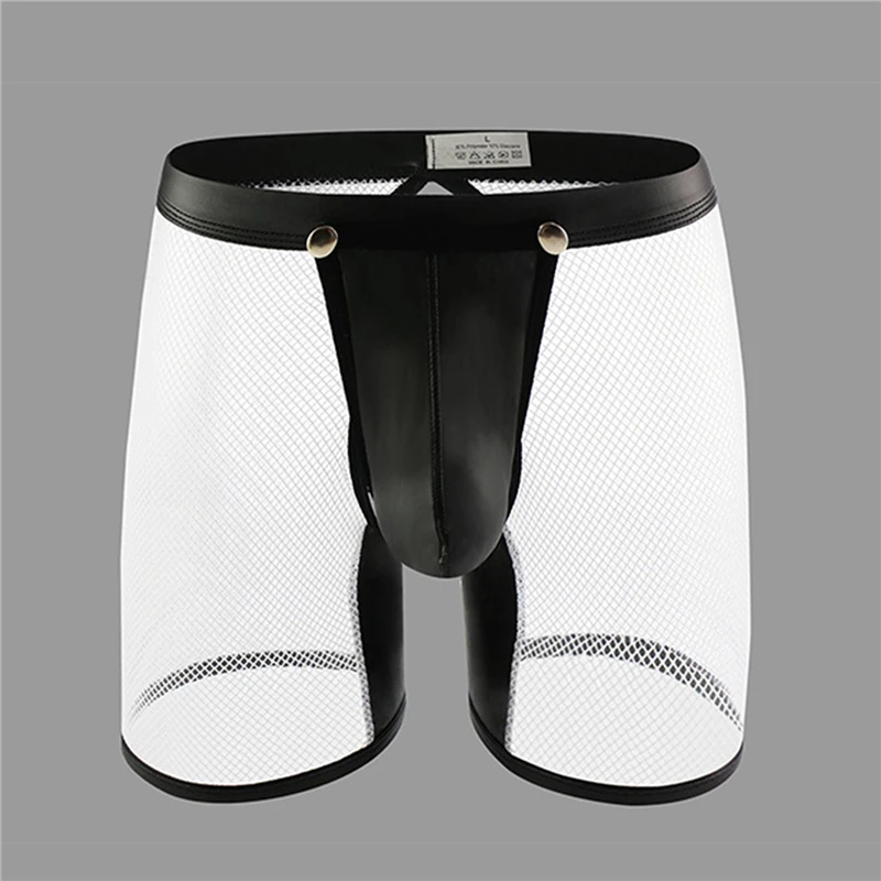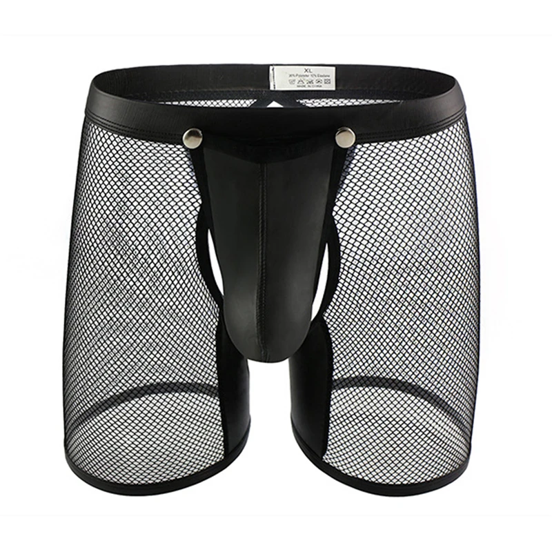 Мужское нижнее белье, нижнее белье-шорты, сексуальное Сетчатое Прозрачное нижнее белье из искусственной кожи, открытые длинные трусы-боксеры, клубная одежда