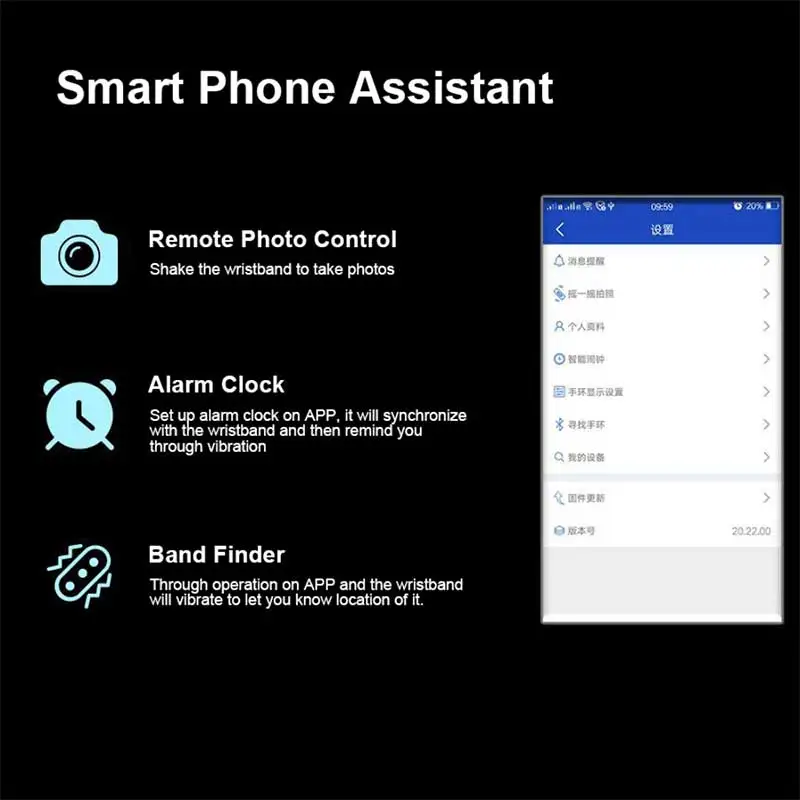 Многофункциональность: Мониторинг частоты сердечных сокращений, подсчет шагов, расчет калорий, отображение RTC, мониторинг сна, напоминания о предстоящих телефонных звонках, нажатие сообщений, будильник, функция анти-потери, дистанционное управление фото, И т. Д ..