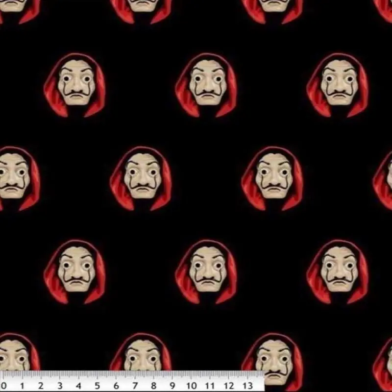 Paper House saga fabric, оригинальная и актуальная серия, на 100% хлопковой Поплиновой основе, на черном тканевом фоне, в сочетании с масками, которые характеризуют пленку. Примените эту ткань для любого вида работы по дому, например, для обивки стульев, изготовления штор, листов или даже для изготовления пижам для взрослых, оригинальная и последняя мода рекомендации по стирке: при помощи машины или вручную при температуре 60 ° не используйте отбеливатель или химические вещества, способные портить ткань. Ширина ткани: 140 cms Grammage: 115 гр/м2