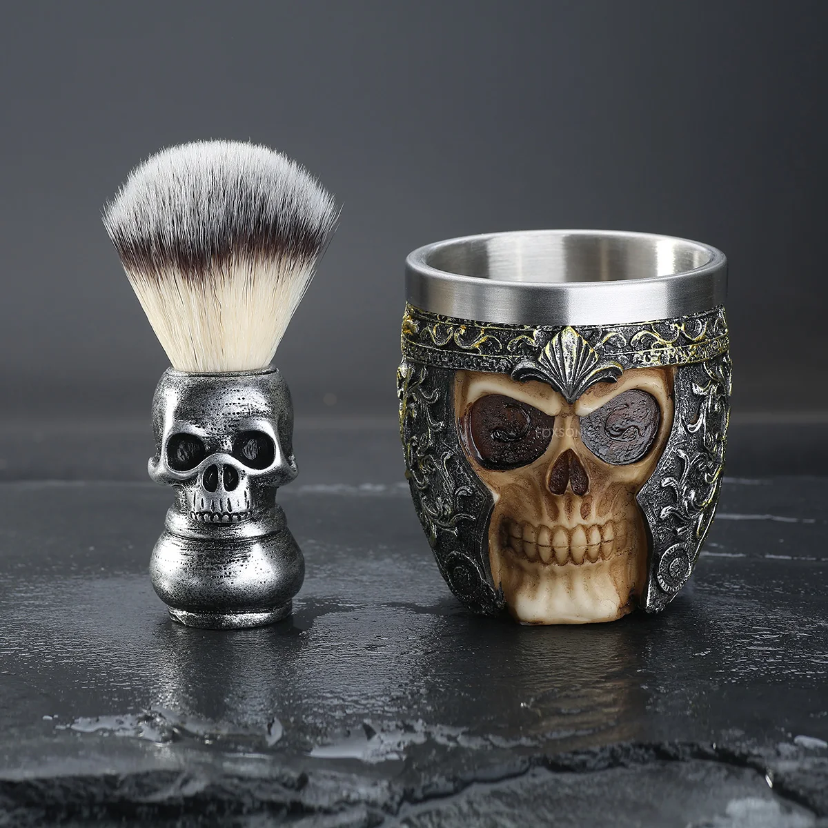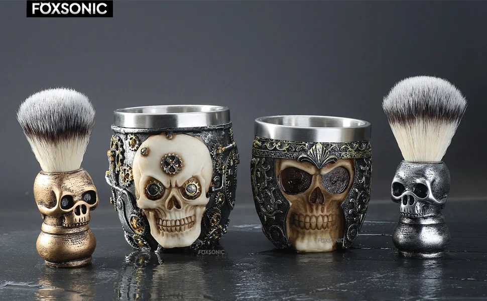Высокое качество холоднолитой смолы Танкард с нержавеющей сталью вставки, 3D дизайн черепа и идеальная детальная щетка для бритья и чаша для бритья.