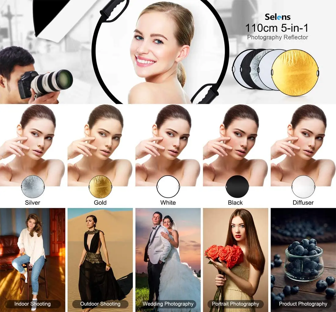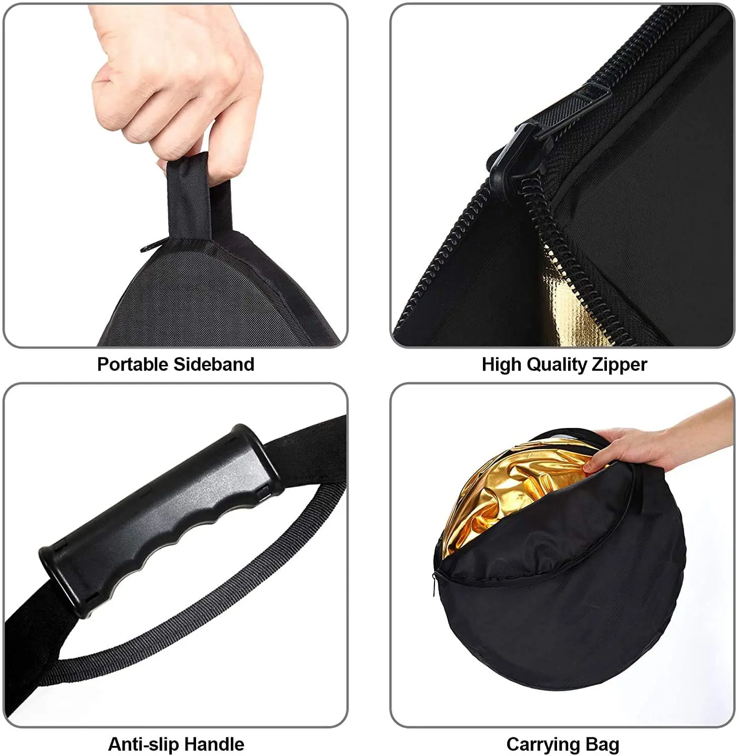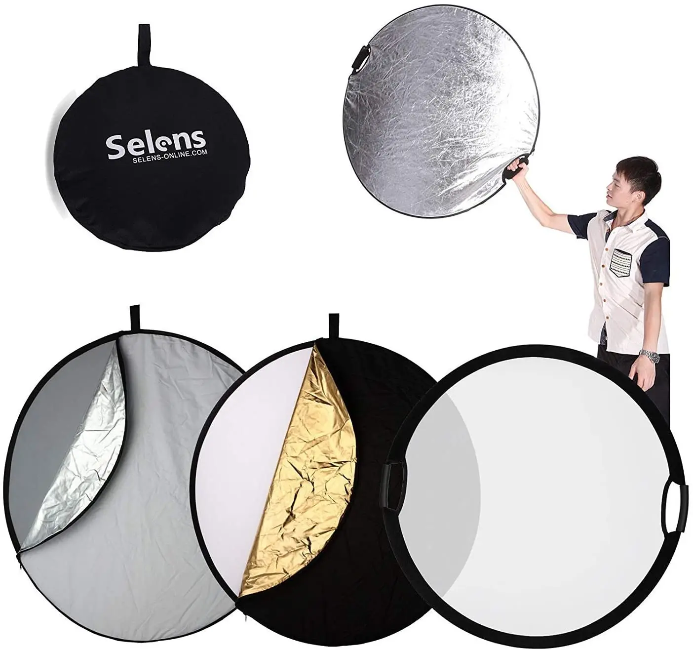 1 x прозрачный панель 1 х Белый Золотой Черный Серебряный чехол 1 х сумка-тоут Форма: круглая Размер: -Размер: 110x110 см/43x43 дюйма -Размер в сложенном виде: 15,7x15,7 дюйма