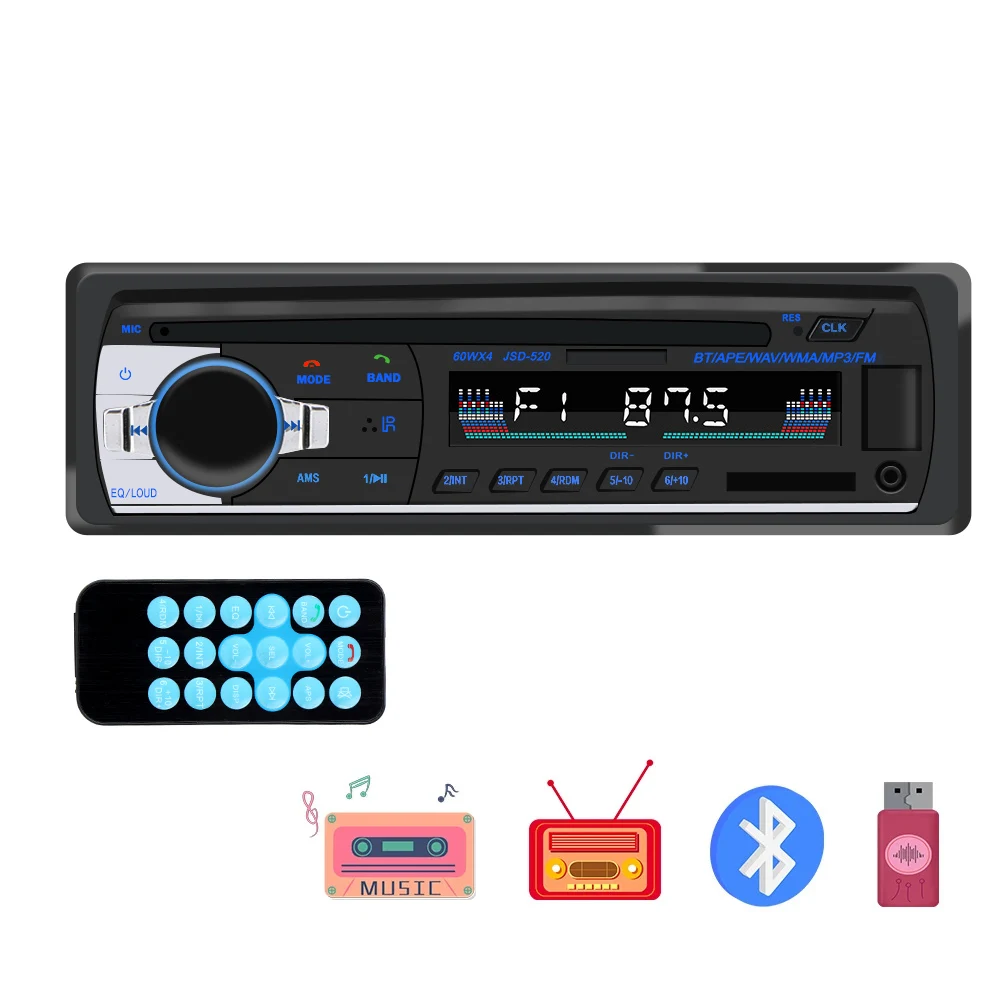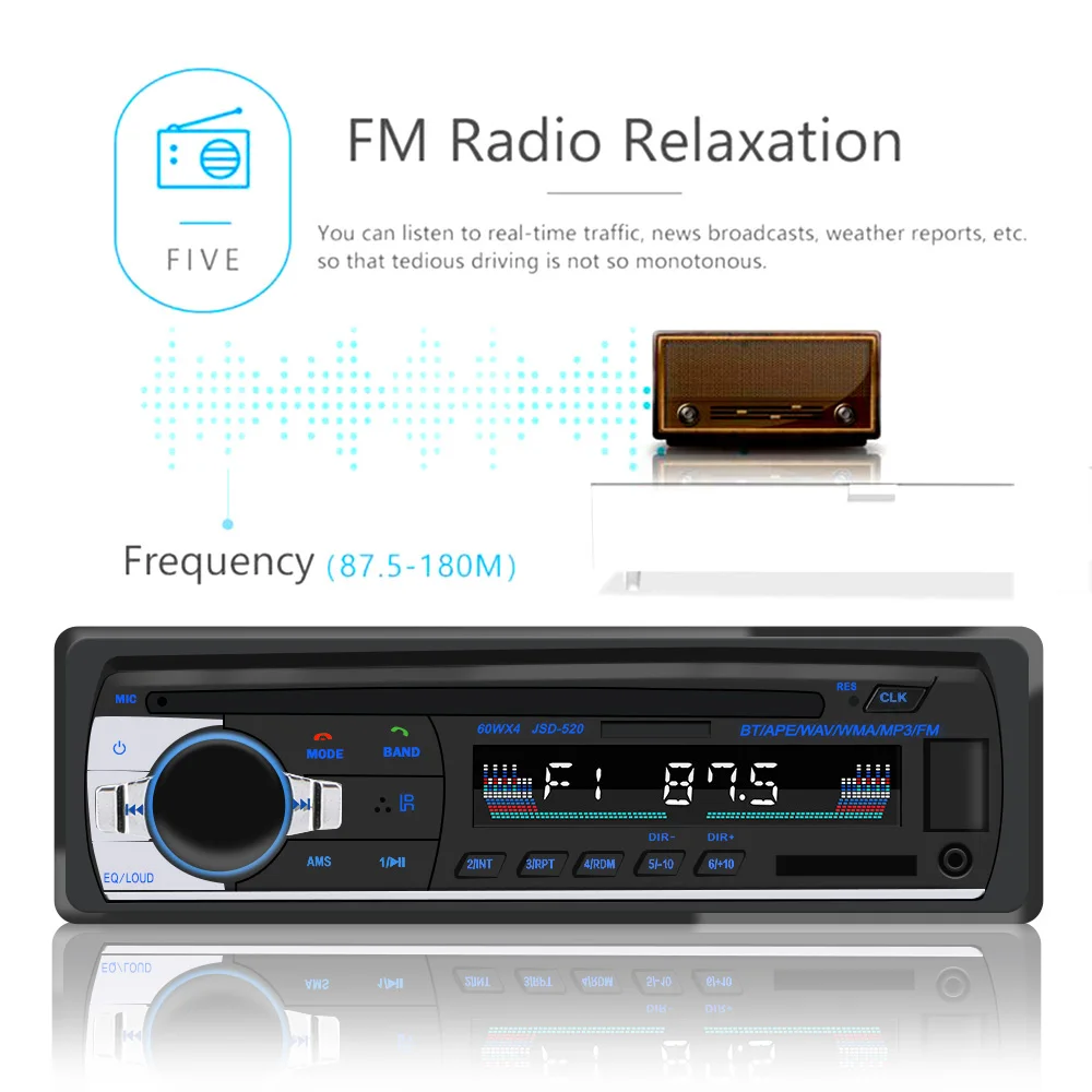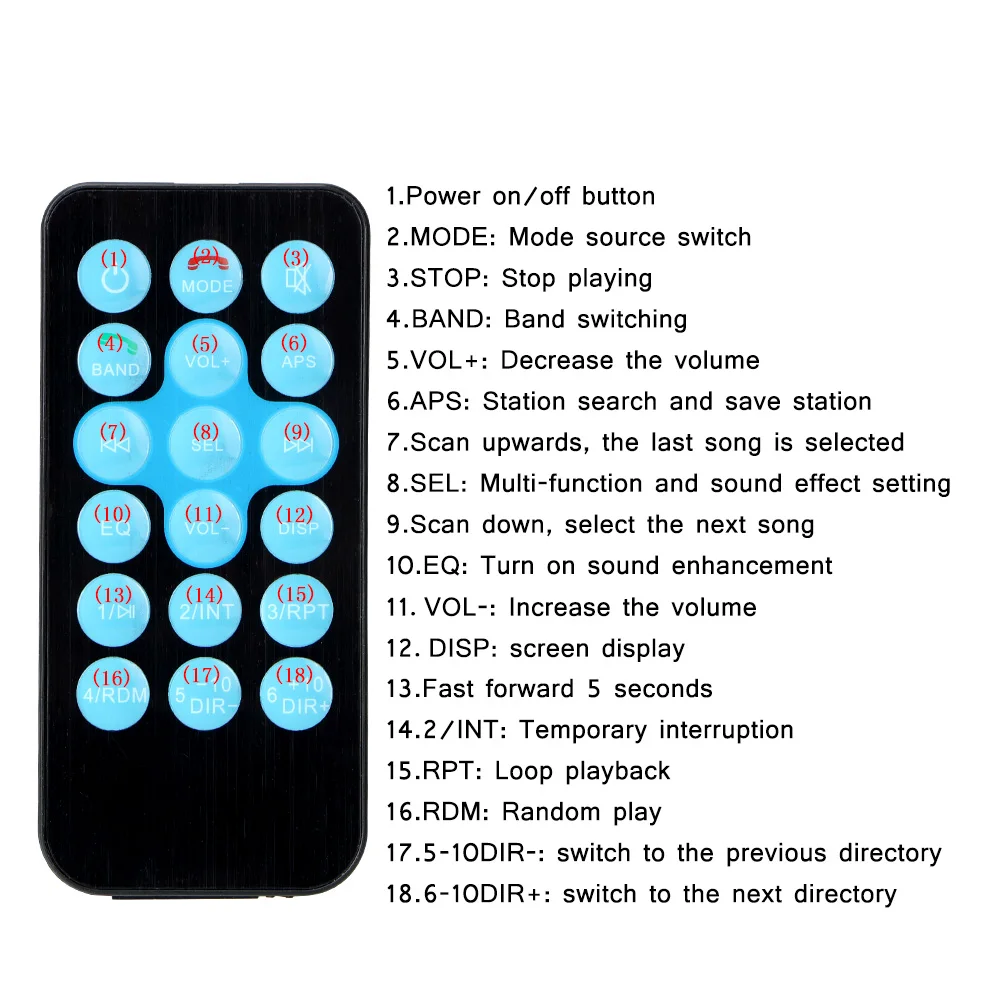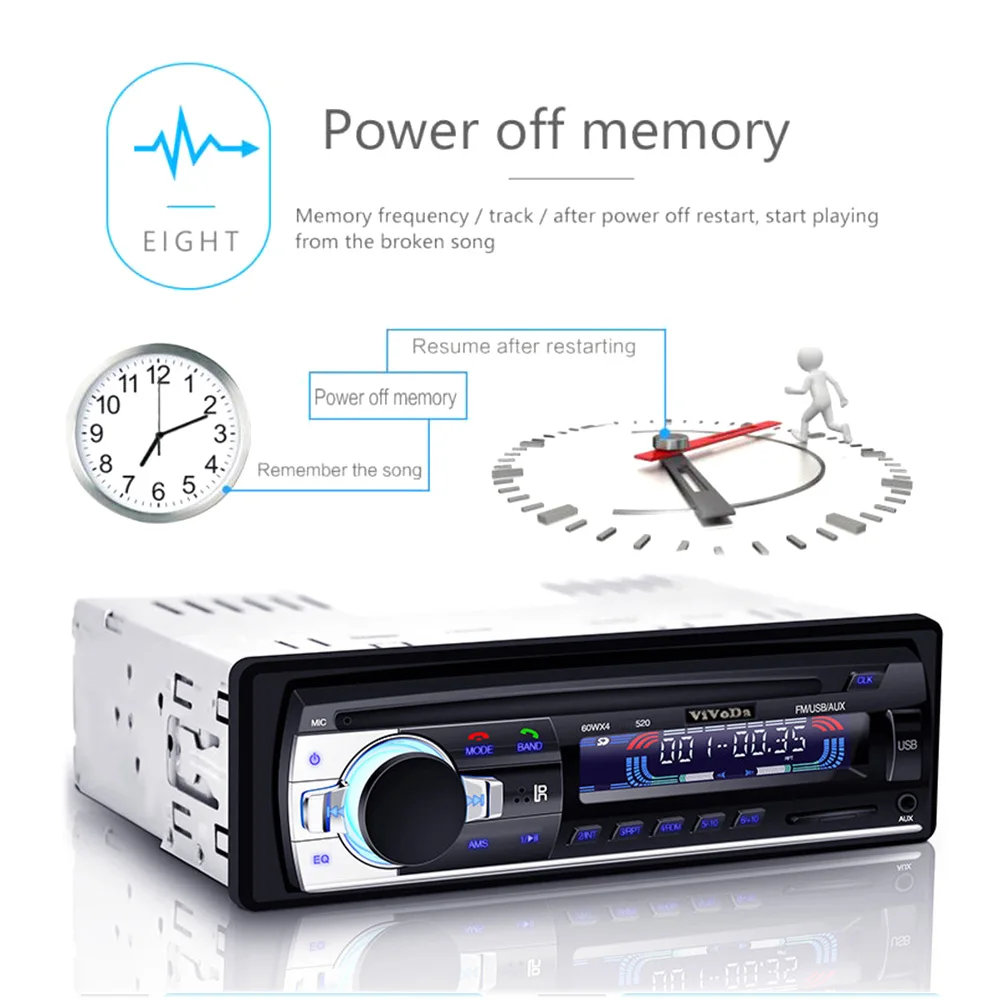 Особенности:Спецификация Bluetooth: V2.0Поддерживает расширенный профиль распределения аудиоФункция отображения времени выключенияЦифровое высококачественное fm-стерео радиоПредустановка 18 станций (частота: 87,5-108 МГц)Поддержка USB / SD / MMC кард-ридерПоддержка аудио: MP3 / WMA / APE / FLAC / WAV и т. Д.MP3 рандомизированный, 10 трек вверх/вниз воспроизведениеЭлектронный регулятор громкости ВЧ, басы, баланс и фейдерВыбор различных эквалайзеров: Джаз, Рок, Поп, Классика и т. Д.Бесшумное и громкое управлениеL / R RCA аудиовыход гнезда4-канальный выход высокой мощности (4 громкоговорителя)Режимы поддержки: BT / APE / WAV / WMA / MP3 / FMАккумулятор дистанционного управления (входит в комплект): CR2025 3V Спецификация:Fm-радиоДиапазон настройки: 87,5-108,0 МГцЧувствительность: менее 20 дБСтерео разделение: более 25 дБSNR: более 60 дБИсточник питания12 В машина: 11 - 16 ВСопротивление вихревого тока динамика: 4 ОмЧастотная характеристика: 20 - 20000 ГцПредохранитель красный: 1A желтый: 15AТип: автомобильный mp3-плеерСпециальная функция: fm-радио, Bluetooth, беспроводные звонки, mp3-плеер, USB флэш-дискВыходная мощность: 4x60 ВтНапряжение: 12 ВИсточники музыки: sd-карта, 3,5 мм стерео для наушников, мобильный телефон, флеш-накопительПримечание: Эта машина 12 В, не в соответствии с аудио источником питания 24 В