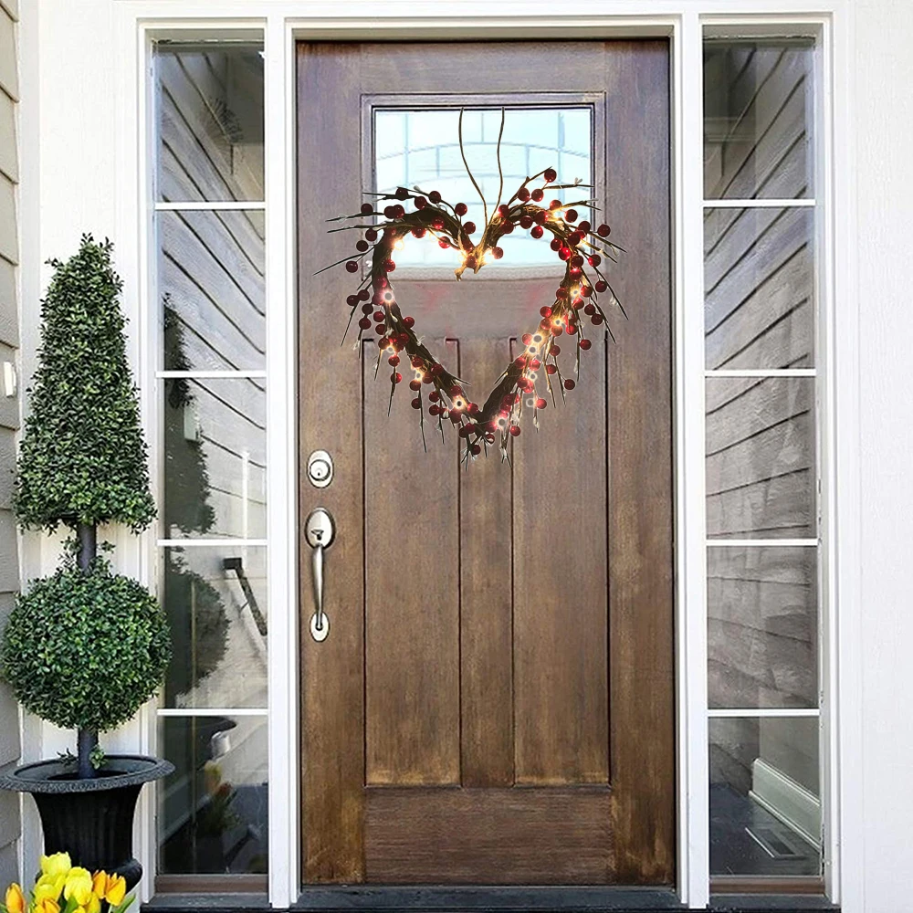 1. Светящиеся в форме сердца красные ягоды венок: 40x35 см ко Дню Святого Валентина венок пре-устанавливать светодиодный с 20 красный светодиодный свет и украшена моделирование красные ягоды и белые семена. Принесите жизненную силу вашей входной двери. 2. Красные огни: венки ко Дню Святого Валентина горят 20 огнями и красного цвета. Требуется 3 батарейки АА (не входят в комплект). 3. Естественный внешний вид коричневой аккумуляторной коробки: венок ко Дню Святого Валентина ручной работы на прочной основе из натуральной лозы. Коричневая барабанная коробка делает ее более естественной, полной и привлекательной. Длительное сохранение цвета. 4. Крытая и уличная гирлянда в форме сердца на передней двери, внутреннее и наружное украшение на День святого Валентина, семейные, вечерние, настенные, камин, гостиная, спальня, столовая, скатерть, окно, стол, офис и т. Д. 5. Простота в использовании-сборка не требуется. Простота в использовании, превращая вашу переднюю дверь в привлекательный праздничный вход. Этот венок ко Дню Святого Валентина приветствует ваших друзей и семью. Отлично подходит для Дня Святого Валентина, юбилеев, свадеб или подарков на новоселье.