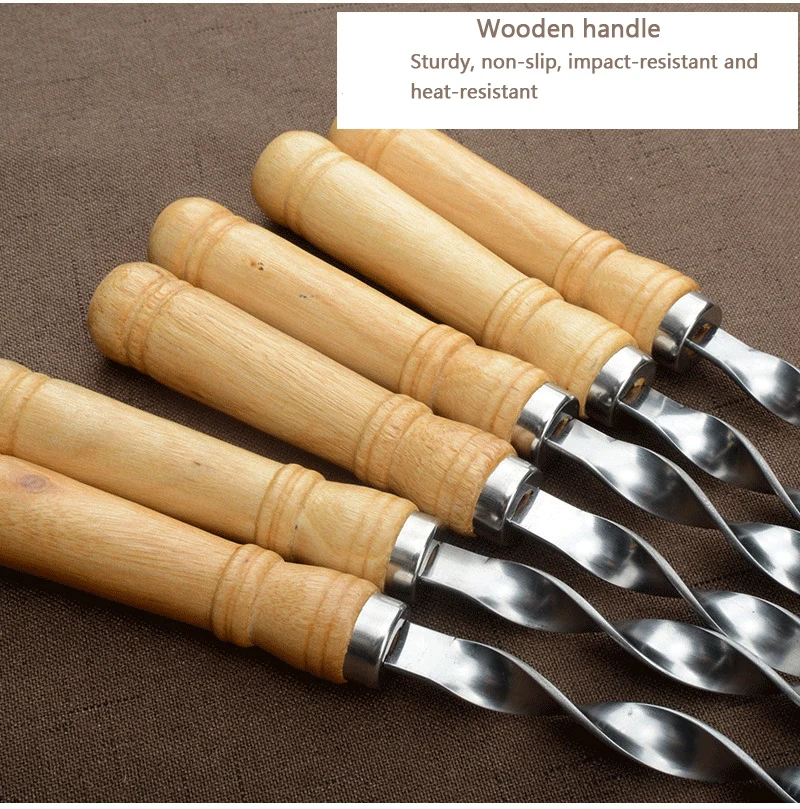 Дизайн ручки:Скрученный Теплоизоляционный дизайн для предотвращения передачи тепла, чтобы избежать ожогов во время приготовления барбекю. Деревянная ручка имеет гладкие края и комфортные ощущения
