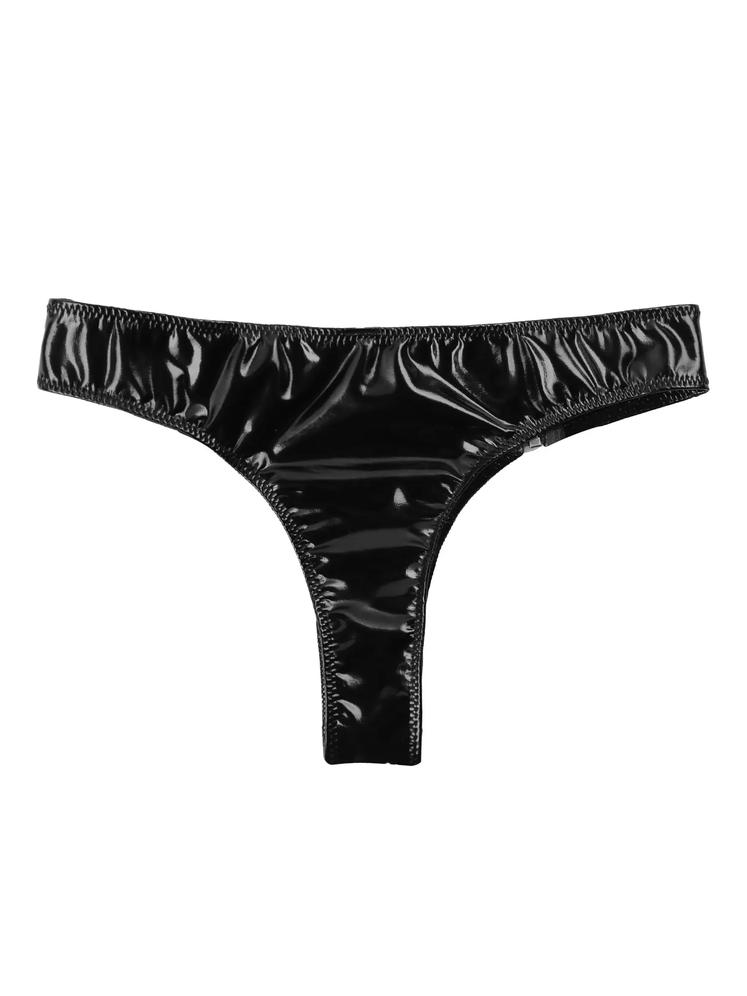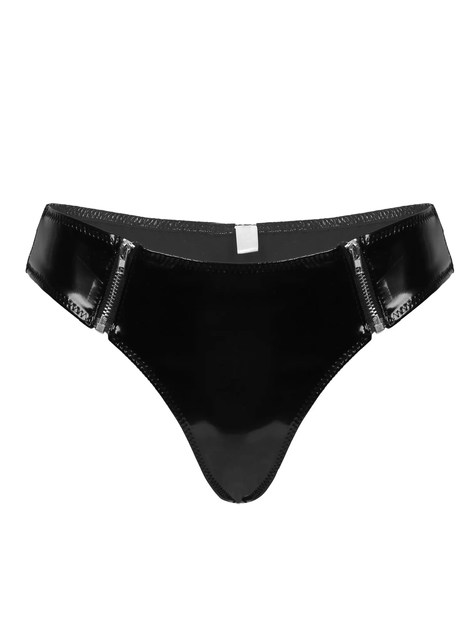 Женские блестящие трусы-бикини из лакированной кожи с низкой талией и застежкой-молнией спереди.