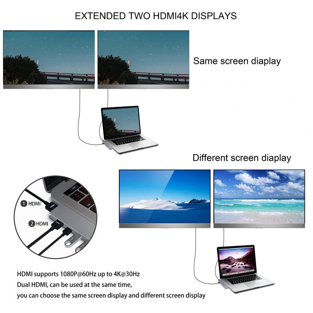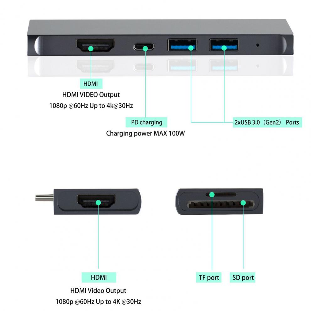 Этот концентратор оснащен несколькими портами, такими как 2 порта USB3.0, 2 порта HDMI, порт для зарядки PD, слот для карт Micro-SD/TF и может поддерживать несколько устройств для одновременной работы.