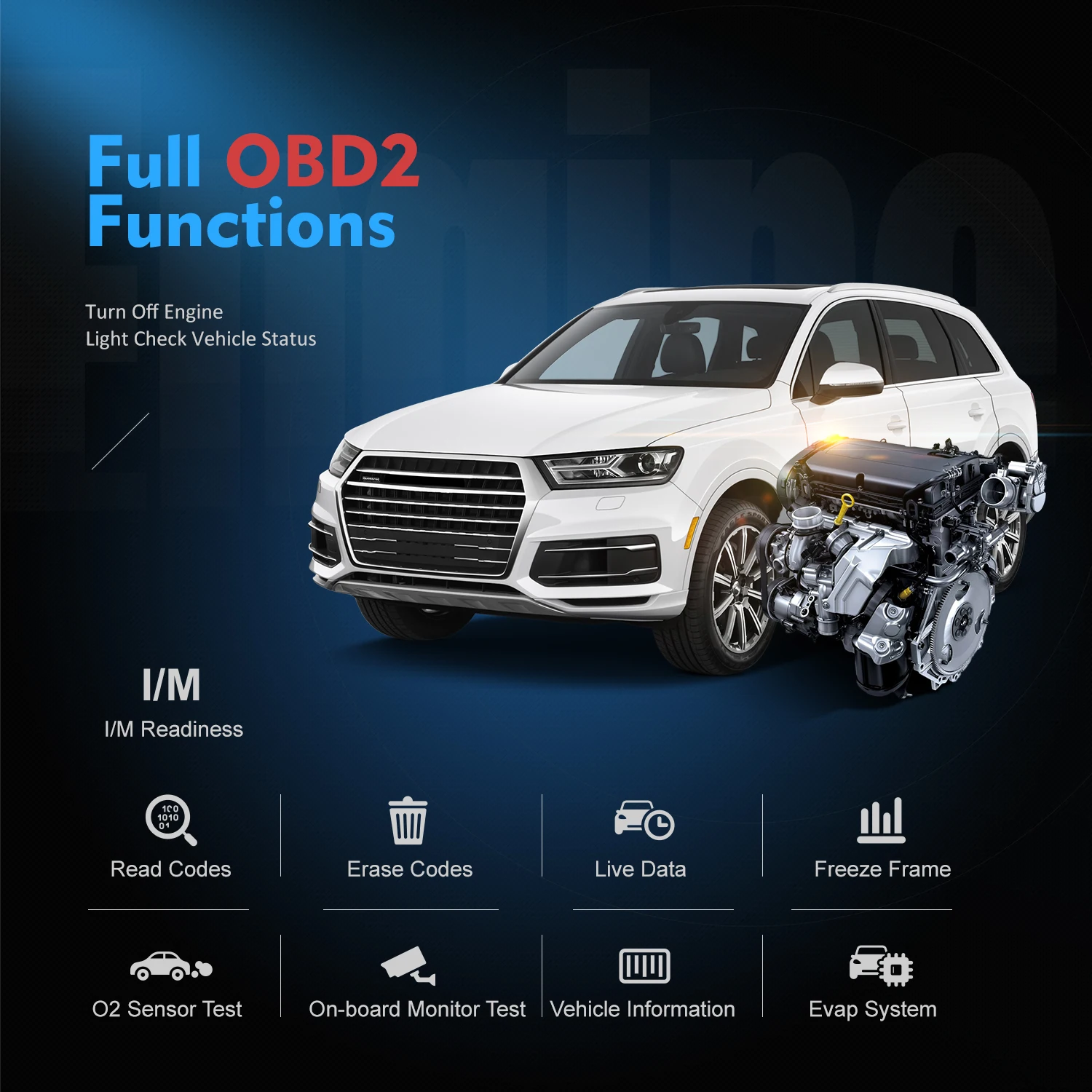 Считывание и стирание кодов для всех доступных систем, выключение MIL light (световой индикатор), отображение прямых данных в текстовом виде, графика и аналоговый для легкого просмотра данных.