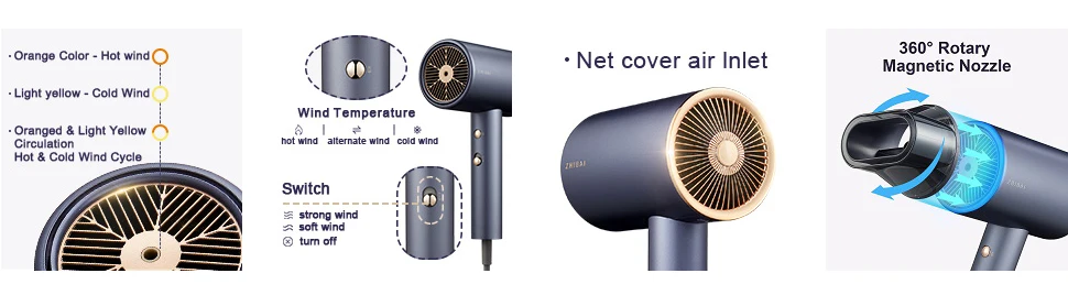 Светильник температуры ветра IndicaTor: выбор различных температур ветра будет отображать другой светильник.3 температуры и 2Настройка скорости: обеспечивает лучший контроль и универсальность различных стилей волос и времени сушки, сохраняет естественную влагу волос.Интимный и SaДизайн fe: двухслойная задняя крышка может уменьшить риск засасывания длинных волос в заднюю крышку.Вращающийся на 360 ° Магнитный мехLe: магнитное сопло принимает трехслойную антиобжигающую конструкцию, чтобы предотвратить ожоги во время сушки волос и легко удалять и устанавливать.