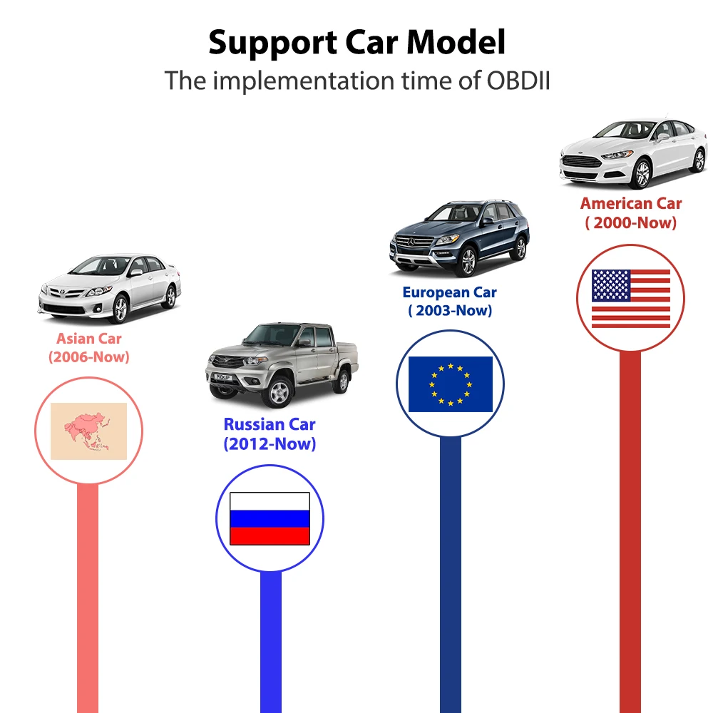 Этот Bluetooth сканер инструмент работает с большинством автомобилей по всему миру в том случае, если ваша машина OBD2 соответствующих протоколу. Этот ELM327 работает только с бензиновыми и дизельными автомобилями 12 В. Сначала проверьте модель автомобиля из списка. Американский автомобиль: с 2000 года Европейский автомобиль: с 2003 года Японский автомобиль: с 2006 года Корейский автомобиль: с 2006 года Китайская машина: с 2009 года Русский автомобиль: с 2012 года