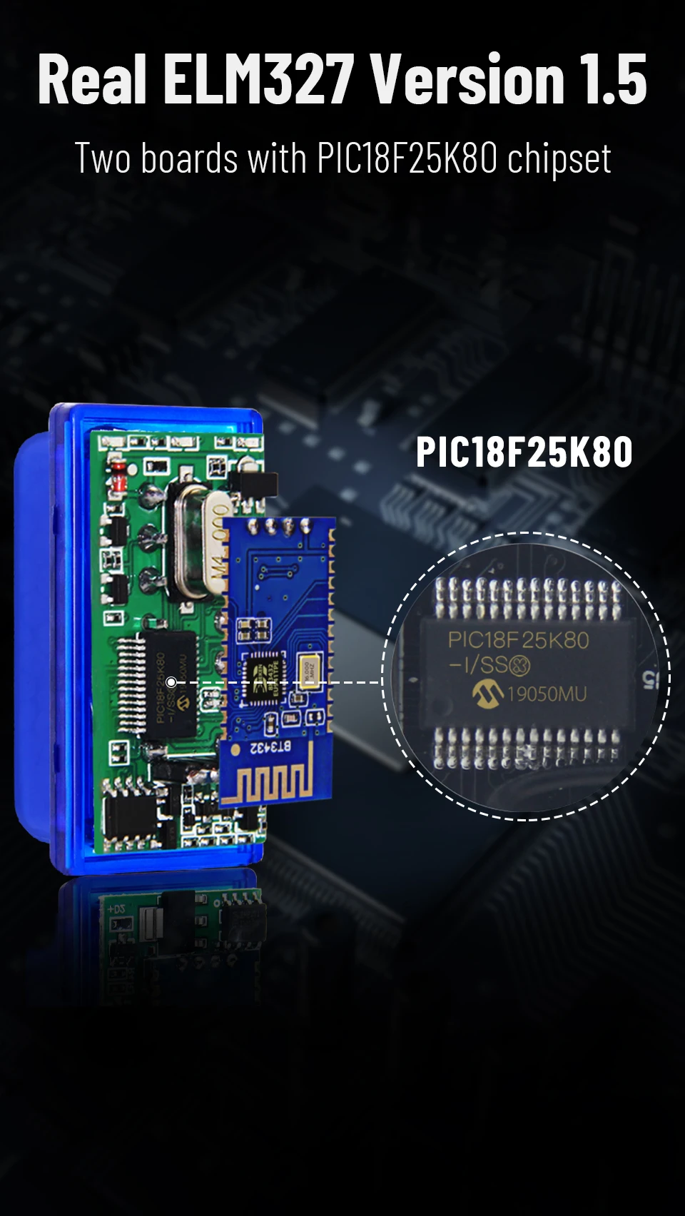 Этот ELM327 V1.5 Использует чипсет PIC18F25K80 и спроектировал две платы для повышения качества сканера.