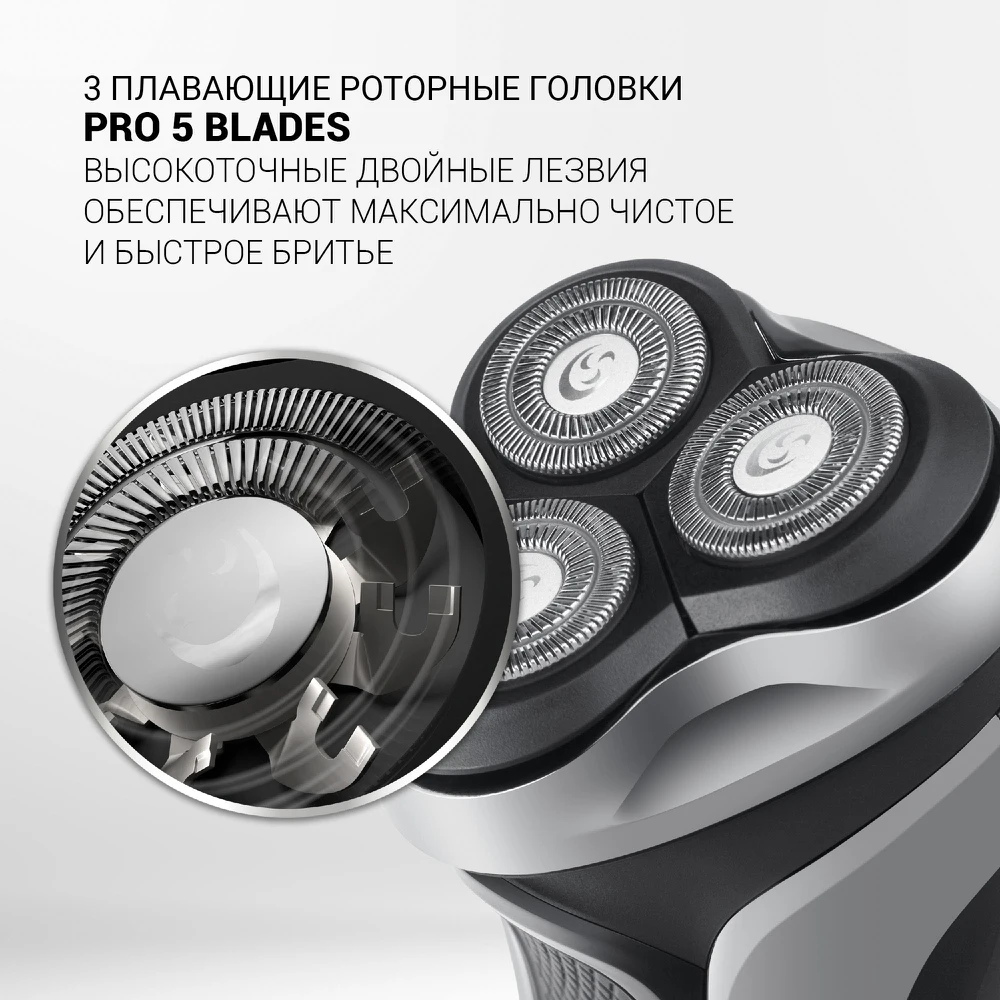 4D СИСТЕМА ПОВТОРЕНИЙ КОНТУРОВ ЛИЦА.3 плавающие роторные головки PRO 5 BLADES. Высокоточные двойные лезвия PRO 5 BLADES. Супермягкие кольца. Сухое и влажное бритье. Работа от аккумулятора. Литиевая батарея. До 75 мин бритья. Полная зарядка 90 мин. Переключатель ВКЛ./ВЫКЛ. Индикатор заряда. Сумочка для хранения и перевозки. Мощность: 4 Вт.