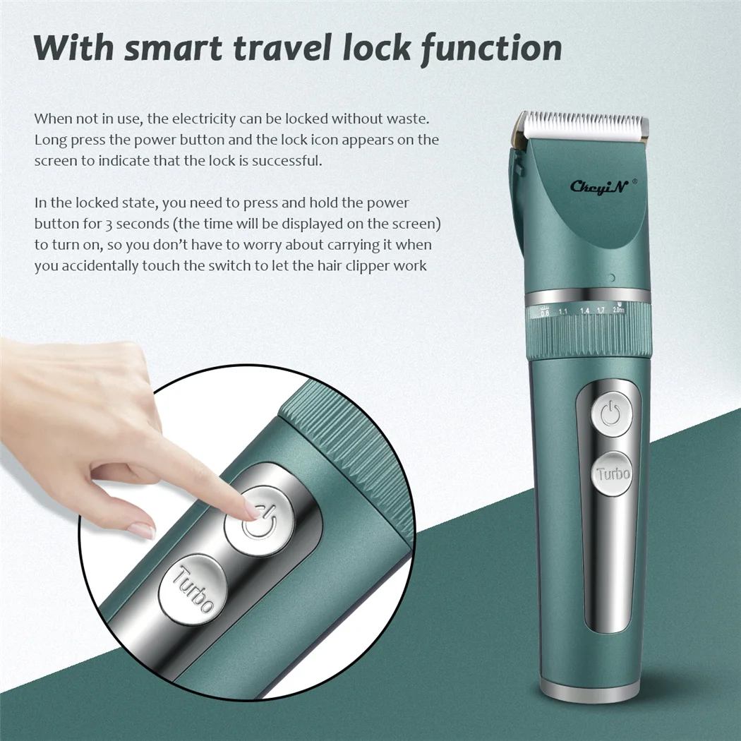 4. USB быстрая зарядка, 2 часа зарядки 120 минут рабочего времени. Светодиодный дисплей с интеллектуальным электрическим количеством и шестерней. Триммер для волос может настроить 3 скорости вращения: 5800 об/мин/6300 об/мин/6800 об/мин для разной текстуры волос.