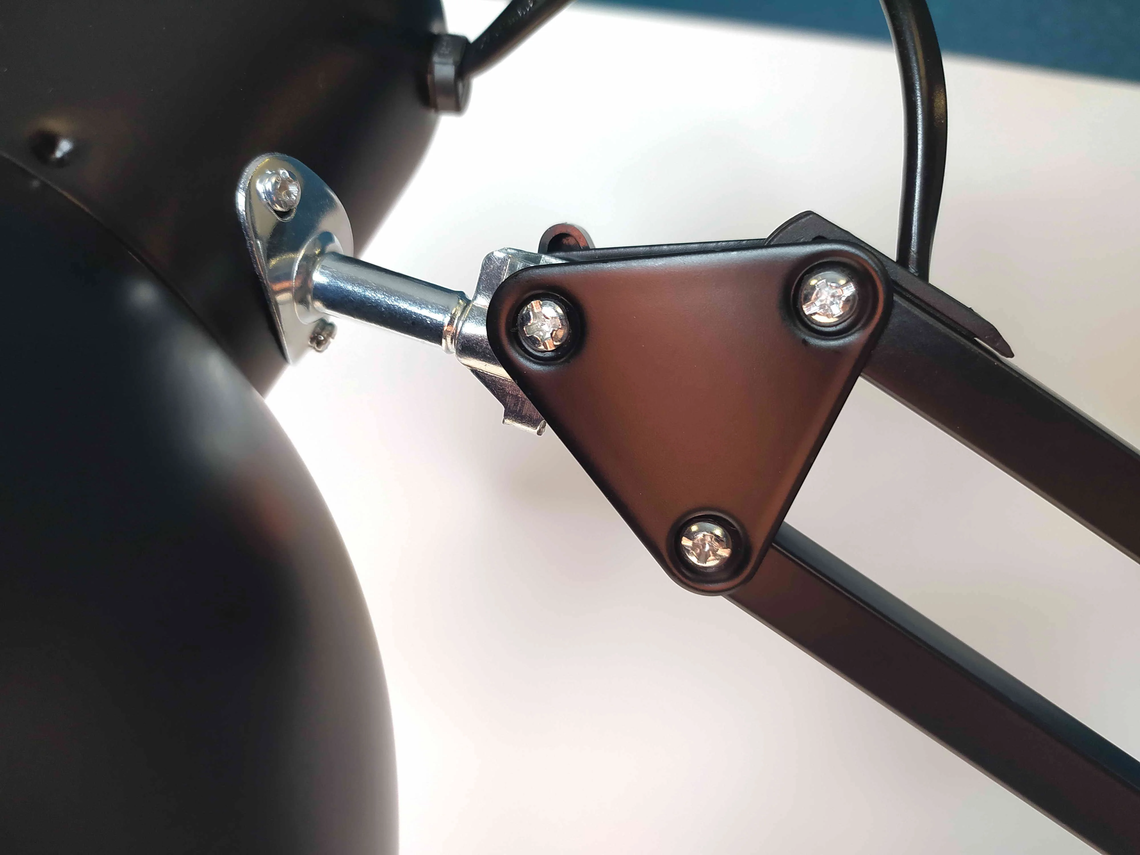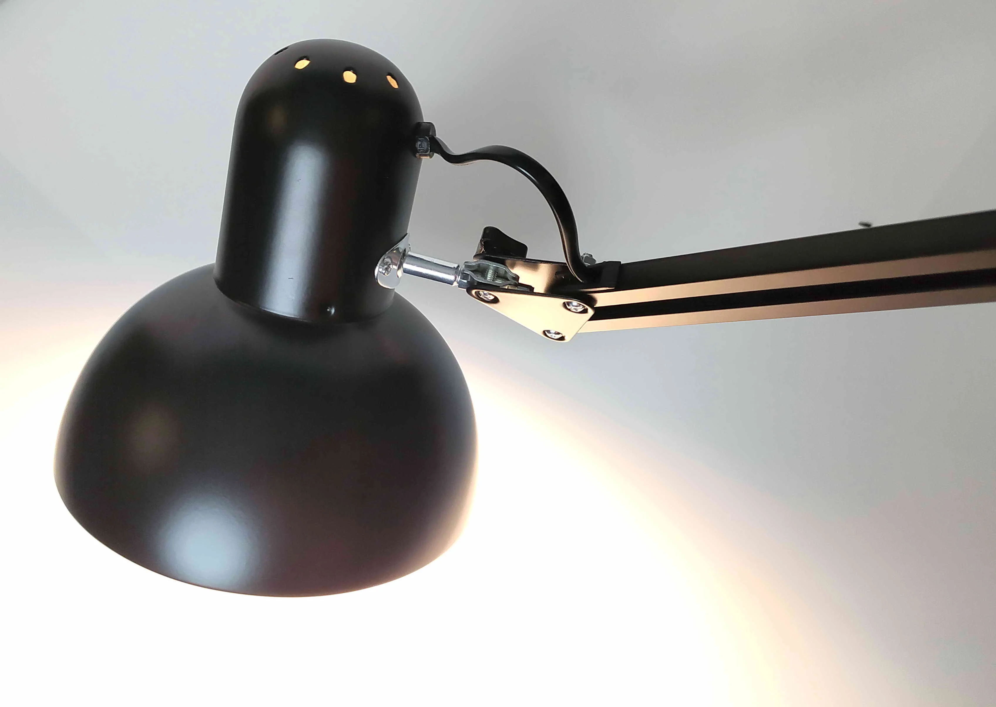 Конструкция настольной лампы на струбцине устроена так, что можно плавно регулировать управлять наклоном и поворотом плафона лампы.