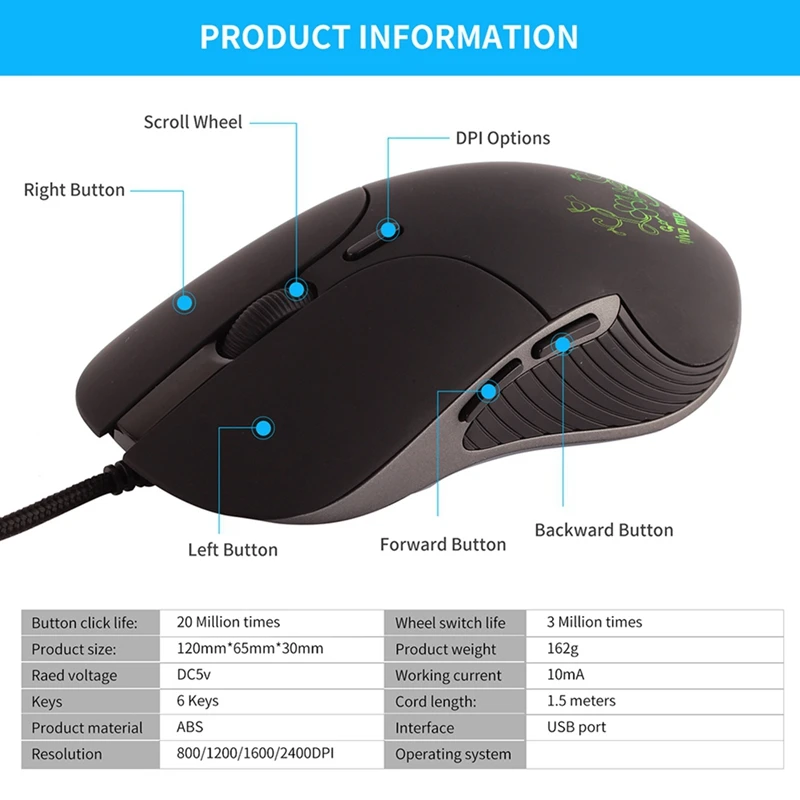 Поддержка четырехскоростной регулировки DPI 1200-1600-2400-3200DPI переменной скорости.
