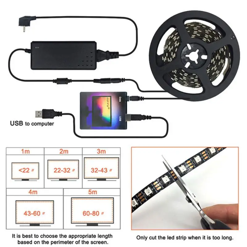 Продукт принимает WS2812 независимый точечный пиксельный светильник. В светильник источник может собрать цвет дисплей видео через контроллер сбора данных. Цвет экрана может переливаться, синхронизировать видео экрана и экран, а яркость и атмосфера можно регулировать через системное программное обеспечение. Он также поддерживает различные музыкальные режимы DIY персонализированные потребности